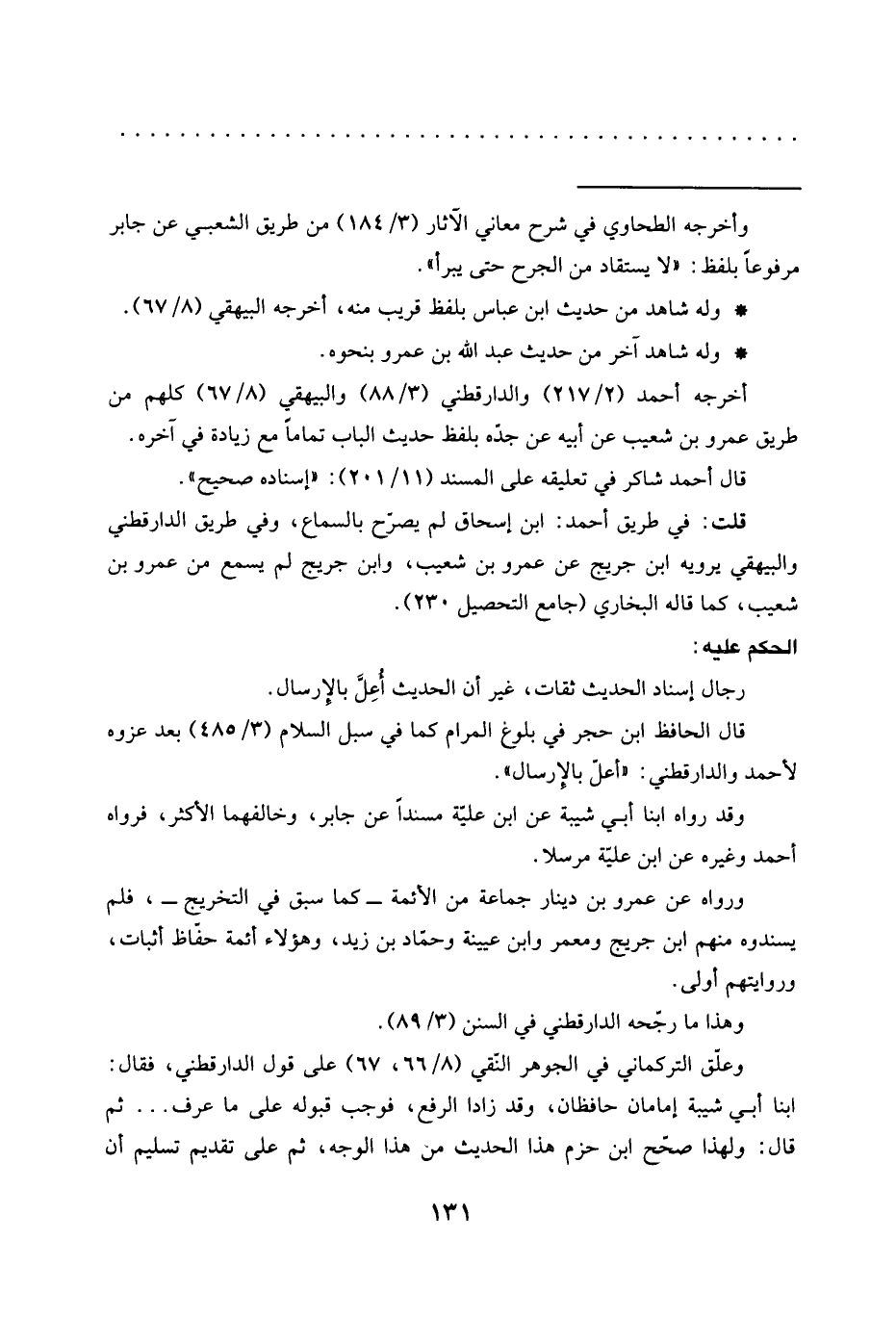 وعلّق التركماني في الجوهر النقي (8/ 66، 67) على قول الدارقطني، فقال: ابنا أبي شيبة إمامان حافظان، وقد زادا الرفع، فوجب قبوله على ما عرف ... ثم قال: ولهذا صحّح ابن حزم هذا الحديث من هذا الوجه، ثم على تقديم تسليم أن =