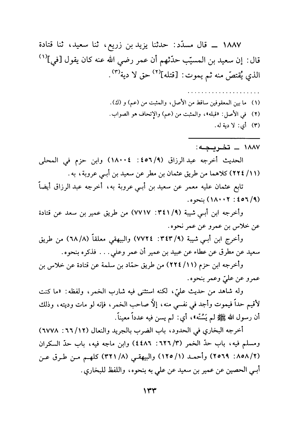 1887 - قال مُسَدَّدٌ حدثنا يَزِيدُ بْنُ زُرَيْعٍ ثنا سَعِيدٌ ثنا قتادة قال أَنَّ سَعِيدَ بْنَ الْمُسَيِّبِ حَدَّثَهُمْ أن عمر رَضِيَ الله عَنْه كَانَ يَقُولُ فِي الَّذِي يُقْتَصُّ مِنْهُ ثُمَّ يَمُوتُ §قَتْلُهُ حَقٌّ لا دِيَةَ -[135]-