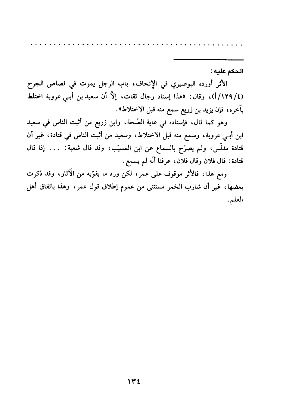 الأثر أورده البوصيري في الإتحاف، باب الرجل يموت في قصاص الجرح (4/ 129/ أ)، وقال: "هذا إسناد رجال ثقات، إلاَّ أن سعيد بن أبي عروبة اختلط بآخره، فإن يزيد بن زريع سمع منه قبل الاختلاط".