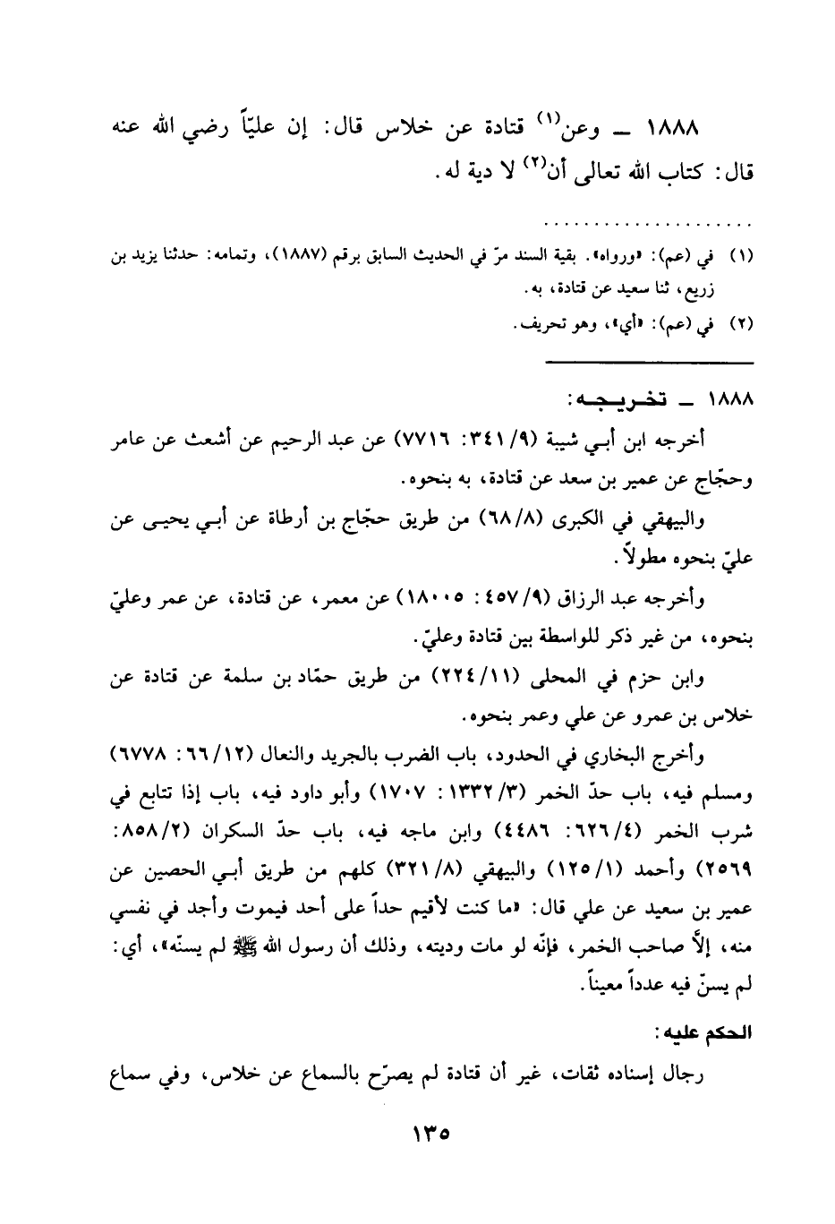 1888 - وعن (¬1) قتادة عن خلاس قَالَ: إِنَّ عَلِيًّا رَضِيَ اللَّهُ عَنْهُ قَالَ: كتاب الله تعالى أن (¬2) لا دية له.