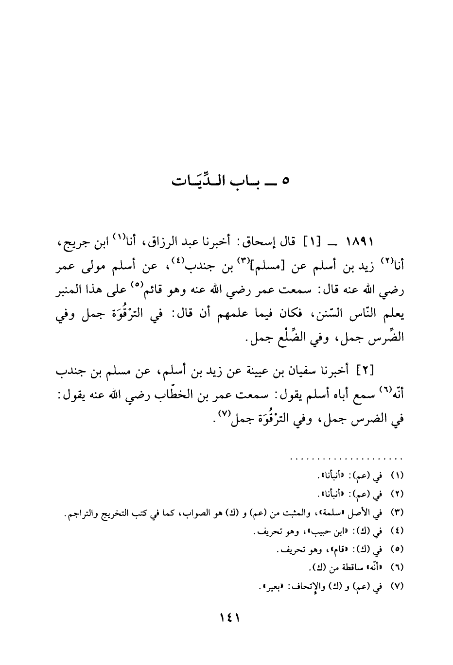 1891 - قَالَ إِسْحَاقُ أَخْبَرَنَا عَبْدُ الرَّزَّاقِ أنا ابْنُ جُرَيْجٍ أنا زَيْدُ بْنُ أَسْلَمَ عَنْ مُسْلِمِ بْنِ جُنْدُبٍ عَنْ أَسْلَمَ مُولَى عُمَرَ رَضِيَ الله عَنْه قال سَمِعْتُ عُمَرَ رَضِيَ الله عَنْه وهو قائم عَلَى هَذَا الْمِنْبَرِ يُعَلِّمُ النَّاسَ السُّنَنَ فَكَانَ فِيمَا عَلَّمَهُمْ أَنْ قَالَ §فِي التَّرْقُوَةِ جَمَلٌ وَفِي الضِّرْسِ جَمَلٌ وَفِي الضِّلَعِ جَمَلٌ
