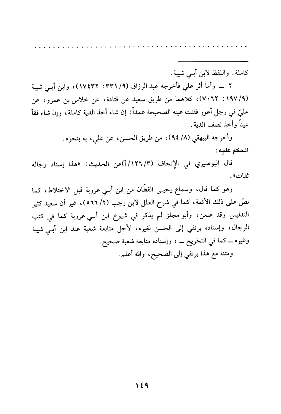 2 - وأما أثر علي فأخرجه عبد الرزاق (9/ 331: 17432)، وابن أبي شيبة (9/ 197: 7062)، كلاهما من طريق سعيد عن قتادة، عن خلاس بن عمرو، عن عليّ في رجل أعور فقئت عينه الصحيحة عمدًا: إن شاء أخذ الدية كاملة، وإن شاء فقأ عينًا وأخذ نصف الدية.