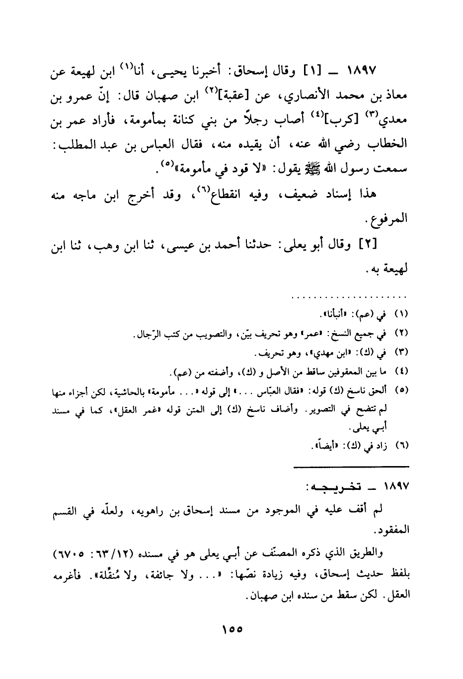 1897 - وَقَالَ إِسْحَاقُ أَخْبَرَنَا يَحْيَى أنا ابْنُ لَهِيعَةَ عَنْ مُعَاذِ بْنِ مُحَمَّدٍ الأنصاري عن عقبة ابن صهبان قال أَنَّ عَمْرَو بن معدي كرب أَصَابَ رَجُلًا مِنْ بَنِي كِنَانَةَ بِمَأْمُومَةٍ فَأَرَادَ عُمَرُ بن الخطاب رَضِيَ الله عَنْه أَنْ يُقِيدَهُ مِنْهُ فَقَالَ الْعَبَّاسُ بْنُ عَبْدِ الْمُطَّلِبِ سَمِعْتُ رَسُولَ اللَّهِ صَلَّى اللَّهُ عَلَيْهِ وَسَلَّمَ يَقُولُ §لَا قَوَدَ فِي مَأْمُومَةٍ [[وَلَا جَائِفَةٍ وَلَا مُنَقِّلَةٍ " فَأَغْرَمَهُ عُمَرُ الْعَقْلَ]] (*)