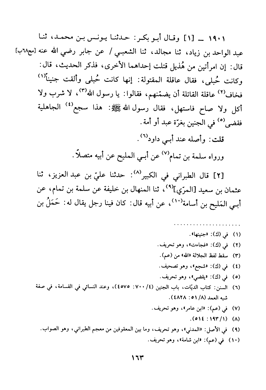 1901 - وَقَالَ أَبُو بَكْرِ حَدَّثَنَا يُونُسُ بْنُ مُحَمَّدٍ ثنا عَبْدُ الْوَاحِدِ بْنِ زِيَادٍ ثنا مُجَالِدٌ ثنا الشَّعْبِيُّ عن جابر رَضِيَ الله عَنْه قال أَنَّ امْرَأَتَيْنِ مِنْ هُذَيْلٍ قَتَلَتْ إِحْدَاهُمَا الْأُخْرَى فَذَكَرَ الْحَدِيثَ قَالَ وَكَانَتْ حُبْلَى فَقَالَ عَاقِلَةُ الْمَقْتُولَةِ إِنَّهَا كَانَتْ حُبْلَى وَأَلْقَتْ جنينا فَخَافَ عاقلة القاتلة أن يضمنهم فَقَالُوا يَا رَسُولَ اللَّهِ لَا شَرِبَ وَلَا أَكَلَ وَلَا صَاحَ فَاسْتَهَلَّ فَقَالَ رَسُولُ اللَّهِ صَلَّى اللَّهُ عَلَيْهِ وَسَلَّمَ هَذَا سَجْعُ الْجَاهِلِيَّةِ §فَقَضَى فِي الْجَنِينِ بِغُرَّةٍ عَبْدٍ أَوْ أَمَةٍ قلت وأصله عند أبى داود ورواه سلمة بن تمام عن أبى المليح عن أبيه متصلا