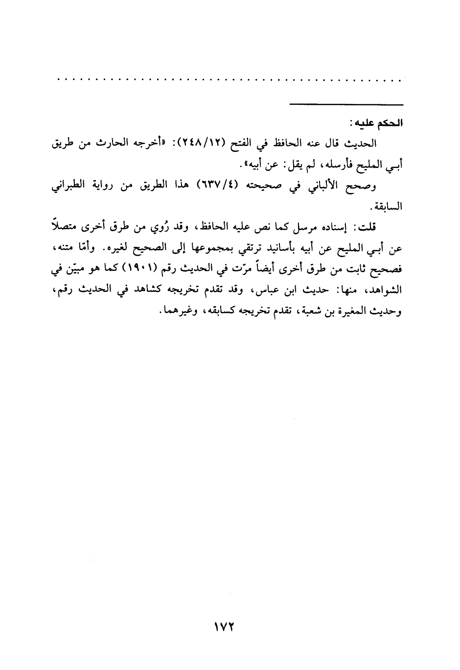 قلت: إسناده مرسل كما نص عليه الحافظ، وقد رُوي من طرق أخرى متصلًا عن أبي المليح عن أبيه بأسانيد ترتقي بمجموعها إلى الصحيح لغيره. وأمّا متنه، فصحيح ثابت من طرق أخرى أيضًا مرت في الحديث رقم (1901) كما هو مبيّن في الشواهد، منها: حديث ابن عباس، وقد تقدم تخريجه كشاهد في الحديث رقم، وحديث المغيرة بن شعبة، تقدم تخريجه كسابقه، وغيرهما.