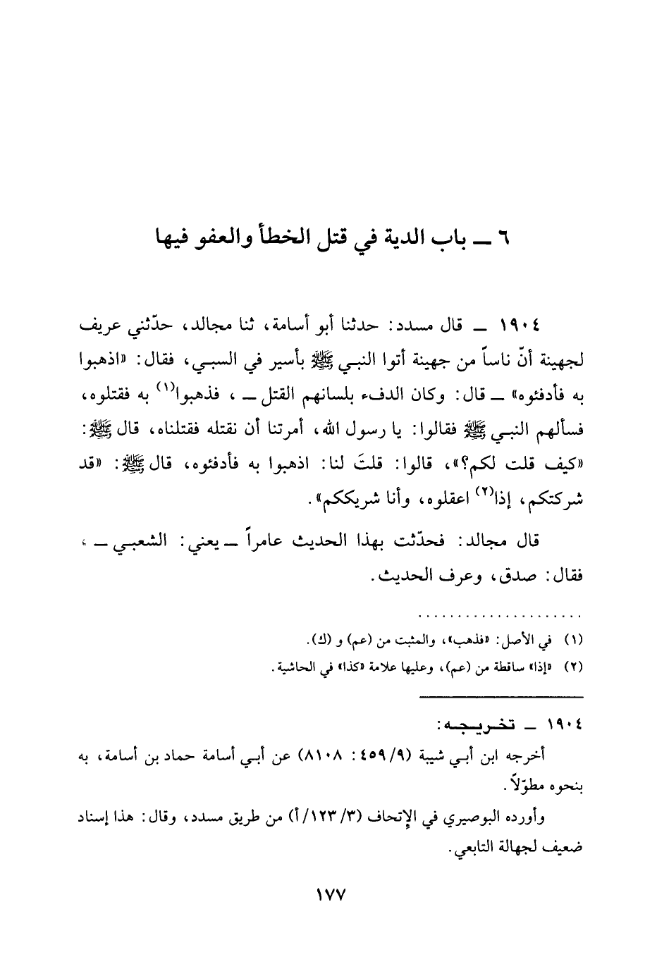 1904 - قَالَ مُسَدَّدٌ حَدَّثَنَا أَبُو أُسَامَةَ ثنا مُجَالِدٌ حَدَّثَنِي عَرِيفٌ لِجُهَيْنَةَ أَنَّ نَاسًا مِنْ جُهَيْنَةَ أَتَوُا النَّبِيَّ صَلَّى اللَّهُ عَلَيْهِ وَسَلَّمَ بِأَسِيرٍ فِي السبي فَقَالَ اذهبوا به فأدفئوه قَالَ وَكَانَ الدفء بِلِسَانِهِمُ الْقَتْلَ فَذَهَبُوا بِهِ فَقَتَلُوهُ فَسَأَلَهُمُ النَّبِيُّ صَلَّى اللَّهُ عَلَيْهِ وَسَلَّمَ فَقَالُوا يَا رَسُولَ اللَّهِ أَمَرْتَنَا أَنْ نَقْتُلَهُ فَقَتَلْنَاهُ قَالَ صَلَّى اللَّهُ عَلَيْهِ وَسَلَّمَ كَيْفَ قُلْتُ لَكُمْ قَالُوا قُلْتَ لَنَا اذْهَبُوا بِهِ فأدفئوه قَالَ صَلَّى اللَّهُ عَلَيْهِ وَسَلَّمَ قَدْ شركتكم إِذًا §اعْقِلُوهُ وَأَنَا شَرِيكُكُمْ