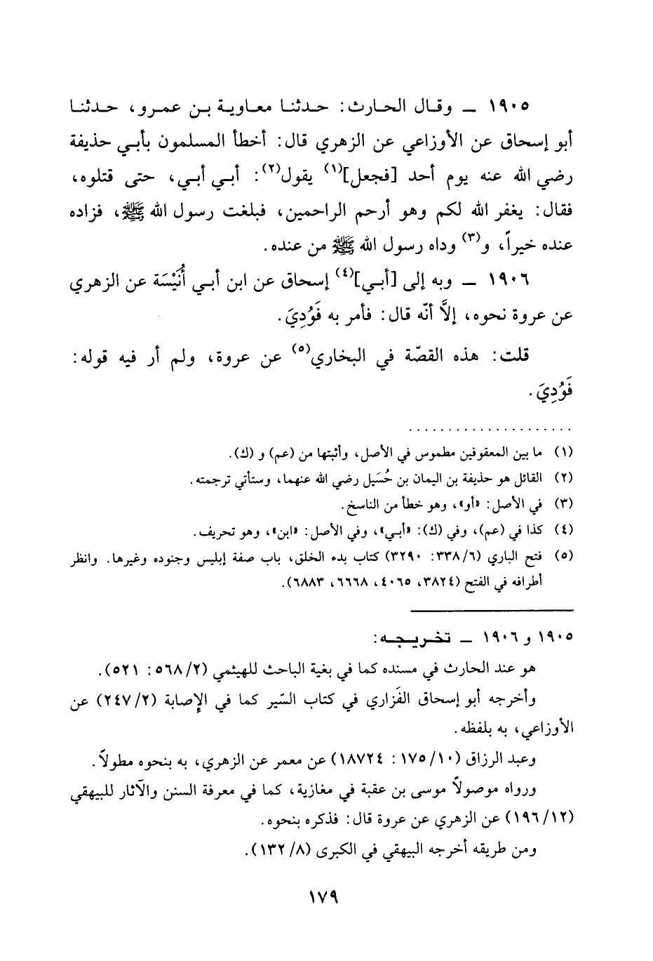 1905 - وَقَالَ الْحَارِثُ حَدَّثَنَا مُعَاوِيَةُ بْنُ عمرو حدثنا أبو إِسْحَاقَ عَنِ الْأَوْزَاعِيِّ عَنِ الزُّهْرِيِّ قَالَ أَخْطَأَ الْمُسْلِمُونَ بأبي حذيفة رَضِيَ الله عَنْه يَوْمَ أُحُدٍ فَجَعَلَ يَقُولُ أَبِي أَبِي حَتَّى قَتَلُوهُ فَقَالَ يَغْفِرُ اللَّهُ لَكُمْ وَهُوَ أَرْحَمُ الرَّاحِمِينَ فَبَلَغَتْ رَسُولَ اللَّهِ صَلَّى اللَّهُ عَلَيْهِ وَسَلَّمَ فَزَادَهُ عِنْدَهُ خَيْرًا §وَوَدَاهُ رَسُولُ اللَّهِ صَلَّى اللَّهُ عَلَيْهِ وَسَلَّمَ مِنْ عِنْدَهِ