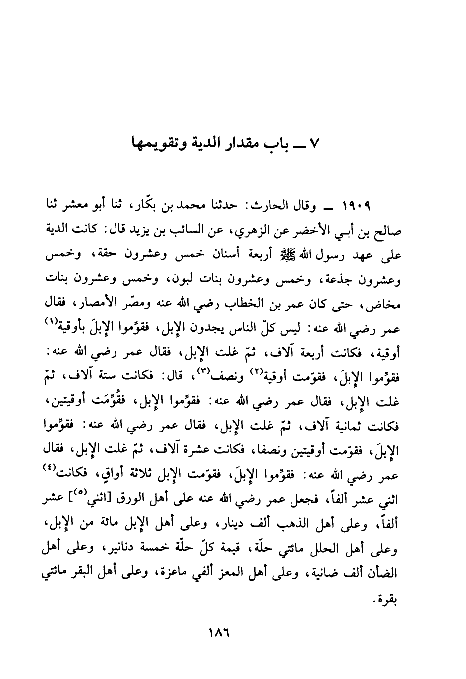 1909 - وقال الْحَارِثُ حَدَّثَنَا مُحَمَّدُ بْنُ بَكَّارٍ ثنا أَبُو مَعْشَرٍ ثنا صَالِحُ بْنُ أَبِي الْأَخْضَرِ عَنِ الزُّهْرِيِّ عَنِ السَّائِبِ بْنِ يَزِيدَ قَالَ §كَانَتِ الدِّيَةُ عَلَى عَهْدِ رَسُولِ اللَّهِ صَلَّى اللَّهُ عَلَيْهِ وَسَلَّمَ أَرْبَعَةَ أَسْنَانٍ خَمْسٌ وَعِشْرُونَ حِقَّةً وَخَمْسٌ وَعِشْرُونَ جَذَعَةً وَخَمْسٌ وَعِشْرُونَ بَنَاتِ لَبُونٍ وَخَمْسٌ وَعِشْرُونَ بَنَاتِ مَخَاضٍ حَتَّى كَانَ عُمَرُ بْنُ الْخَطَّابِ رَضِيَ الله عَنْه وَمَصَّرَ الْأَمْصَارَ فَقَالَ عُمَرُ رَضِيَ الله عَنْه لَيْسَ كُلُّ النَّاسِ يَجِدُونَ الْإِبِلَ فَقَوِّمُوا الْإِبِلَ بأوقية أُوقِيَّة فَكَانَتْ أَرْبَعَةَ آلَافٍ ثُمَّ غَلَتِ الْإِبِلُ فَقَالَ عُمَرُ رَضِيَ الله عَنْه فقَوِّمُوا الْإِبِلَ فَقُوِّمَتْ أوقية ونصف قال فكانت ستة آلاف ثم غلت الإبل فقال عمر رَضِيَ الله عَنْه فقَوِّمُوا الْإِبِلَ فَقُوِّمَتْ أُوقِيَّتَيْنِ فَكَانَتْ ثَمَانِيَةَ آلَافٍ ثُمَّ غَلَتِ الْإِبِلُ فَقَالَ عُمَرُ رَضِيَ الله عَنْه فقوموا الإبل فقدمت أُوقِيَّتَيْنِ وَنِصْفًا فَكَانَتْ عَشْرَةَ آلَافٍ ثُمَّ غَلَتِ الْإِبِلُ فَقَالَ عُمَرُ رَضِيَ الله عَنْه فقَوِّمُوا الْإِبِلَ فَقُوِّمَتْ الإبل ثلاثة أَوَاقٍ فَكَانَتِ اثْنَيْ عَشَرَ أَلْفًا فَجَعَلَ عُمَرُ رَضِيَ الله عَنْه عَلَى أَهْلِ الْوَرِقِ اثْنَيْ عَشَرَ أَلْفًا وَعَلَى أَهْلِ الذَّهَبِ أَلْفَ دِينَارٍ وَعَلَى أَهْلِ الْإِبِلِ مِائَةً مِنَ الْإِبِلِ وَعَلَى أَهْلِ الْحُلَلِ مِائَتَيْ حُلَّةٍ قِيمَةُ كُلِّ حُلَّةٍ خَمْسَةُ دَنَانِيرَ وَعَلَى أَهْلِ الضأن ألف ضانية وَعَلَى أَهْلِ الْمَعْزِ أَلْفَيْ مَاعِزَةٍ وَعَلَى أَهْلِ الْبَقَرِ مِائَتَيْ بَقَرَةٍ
