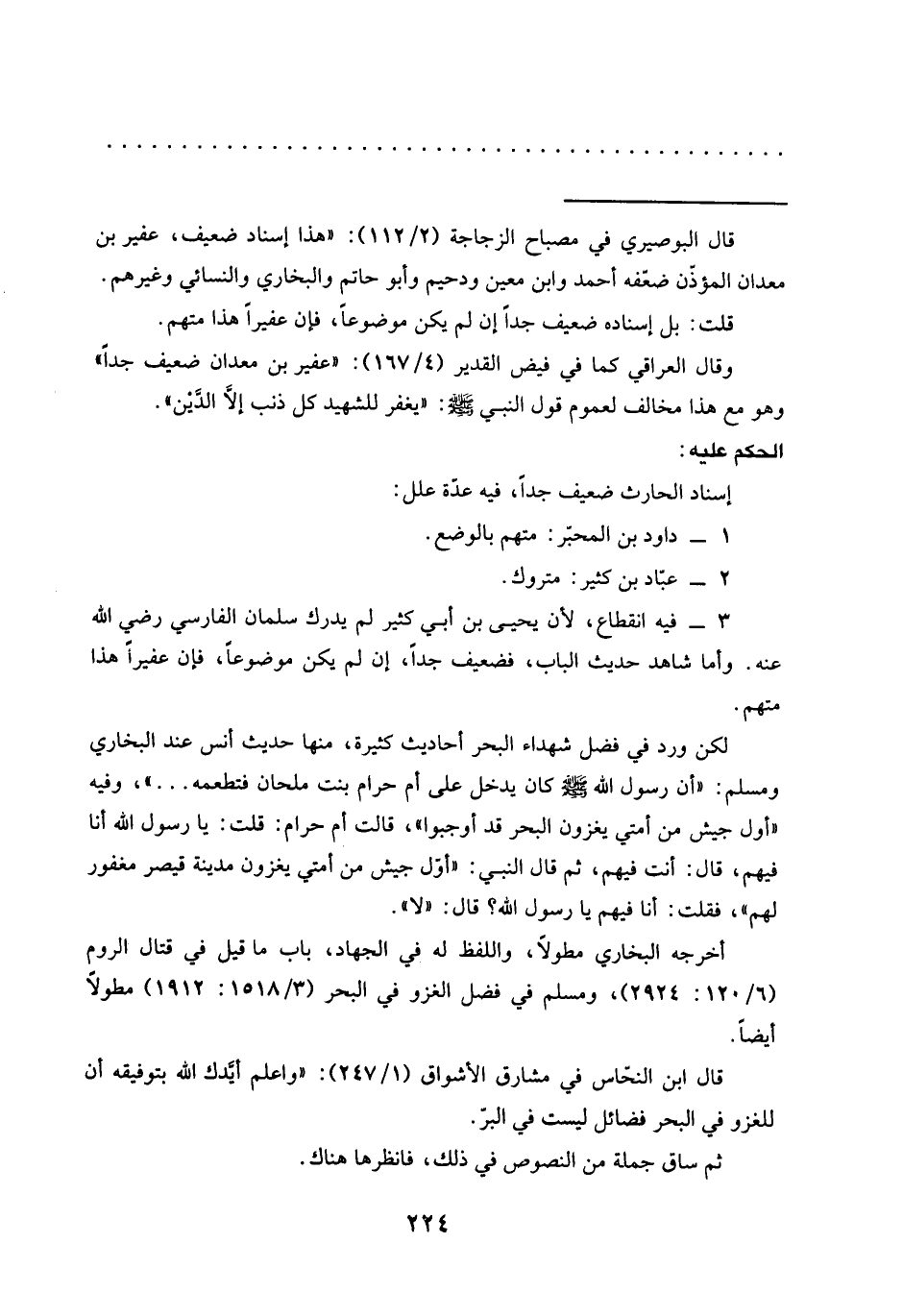 لكن ورد في فضل شهداء البحر أحاديث كثيرة، منها حديث أنس عند البخاري ومسلم: "أن رسول الله -صلى الله عليه وسلم- كان يدخل على أم حرام بنت ملحان فتطعمه ... "، وفيه "أول جيش من أمتي يغزون البحر قد أوجبوا"، قالت أم حرام: قلت: يا رسول الله أنا فيهم، قال: أنت فيهم، ثم قال النبي: "أوّل جيش من أمتي يغزون مدينة قيصر مغفور لهم"، فقلت: أنا فيهم يا رسول الله؟ قال: "لا".
