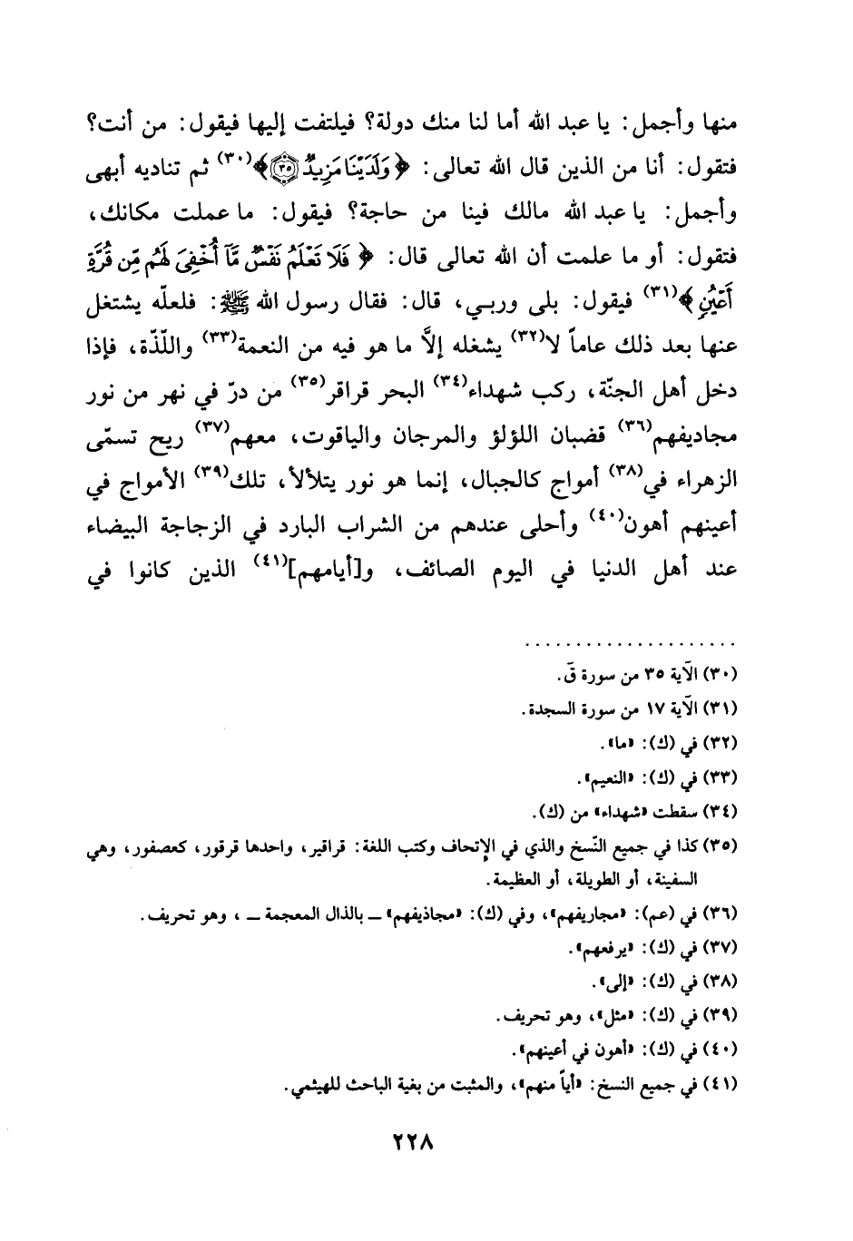 مِنْهَا وَأَجْمَلُ: يَا عَبْدَ اللَّهِ أَمَا لَنَا مِنْكَ دَوْلَةٌ؟ فَيَلْتَفِتُ إِلَيْهَا فَيَقُولُ: مَنْ أَنْتِ؟ فَتَقُولُ: إِنَّا مِنَ الَّذِينَ قَالَ اللَّهُ تَعَالَى {وَلَدَيْنَا مَزِيدٌ (35)} (¬30) ثم تناديه أبهى وأجمل: يا عبد الله مالك فينا من حاجة؟ فيقول: ما عملت مكانك، فتقول: أَوْ مَا عَلِمْتَ أَنَّ اللَّهَ تَعَالَى قَالَ: {فَلَا تَعْلَمُ نَفْسٌ مَا أُخْفِيَ لَهُمْ مِنْ قُرَّةِ أَعْيُنٍ} (¬31) فَيَقُولُ: بَلِيَ وَرَبِّي، قَالَ: فَقَالَ رَسُولُ اللَّهِ -صَلَّى اللَّهُ عَلَيْهِ وَسَلَّمَ-: فَلَعَلَّهُ يَشْتَغِلُ عَنْهَا بعد ذلك عامًا لا (¬32) يشغله إلَّا ما هو فيه من النعمة (¬33) واللّذة، فإذا دخل أهل الجنة، ركب شهداء (¬34) البحر قراقر (¬35) مِنْ دُرٍّ فِي نَهَرٍ مِنْ نُورٍ مَجَادِيفُهُمْ (¬36) قُضْبَانُ اللُّؤْلُؤِ وَالْمَرْجَانِ وَالْيَاقُوتِ، مَعَهُمْ (¬37) رِيحٌ تُسَمَّى الزهراء في (¬38) أمواجٍ كَالْجِبَالِ، إِنَّمَا هُوَ نُورٌ يَتَلَأَلَأُ، تِلْكَ (¬39) الأمواج في أعينهم أهون (¬40) وَأَحْلَى عِنْدَهُمْ مِنَ الشَّرَابِ الْبَارِدِ فِي الزُّجَاجَةِ الْبَيْضَاءِ عِنْدَ أَهْلِ الدُّنْيَا فِي الْيَوْمِ الصَّائِفِ، و [أيامهم] (¬41) الذين كانوا في
