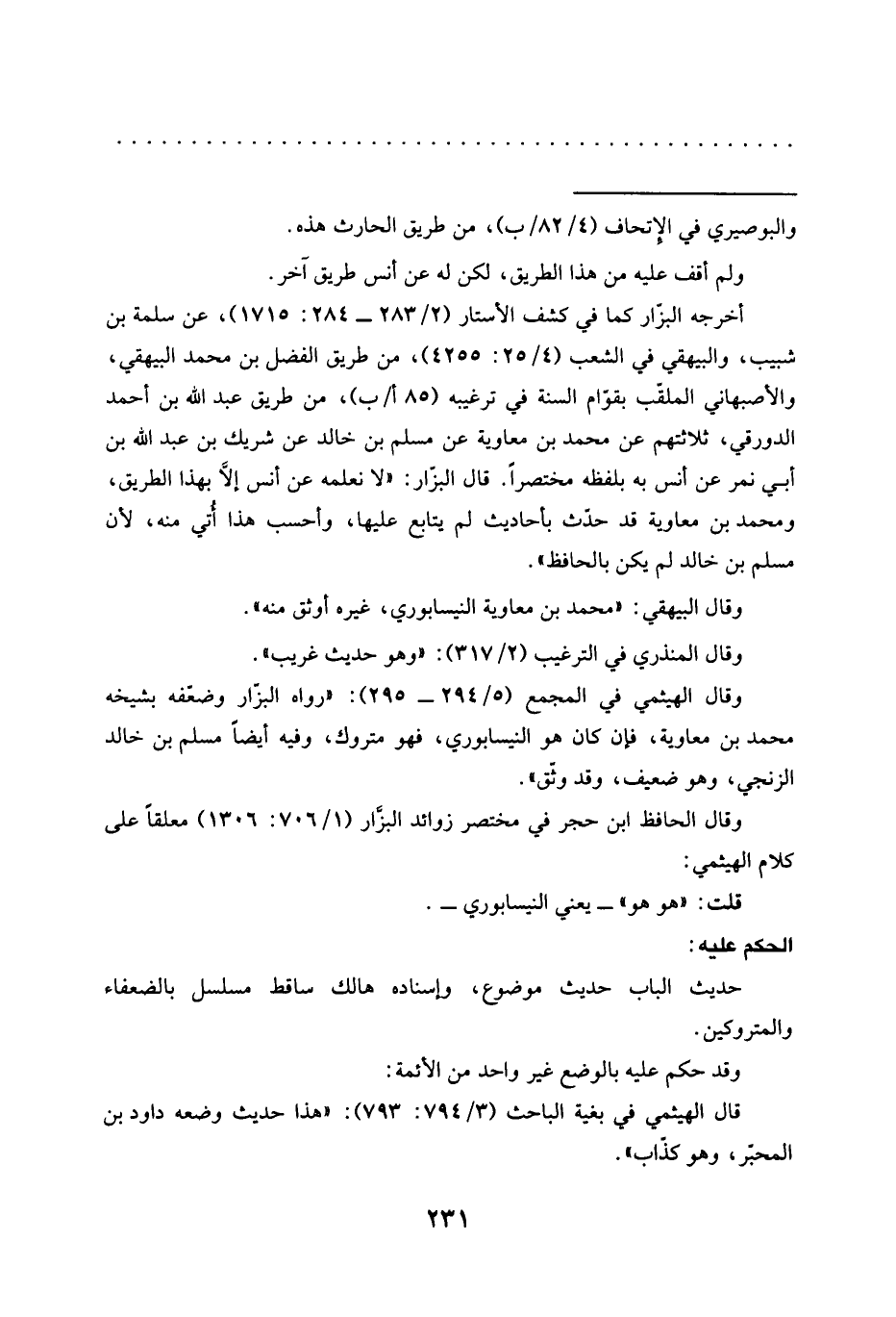 وقال الهيثمي في المجمع (5/ 294 - 295): "رواه البزار وضعّفه بشيخه محمَّد بن معاوية، فإن كان هو النيسابوري، فهو متروك، وفيه أيضًا مسلم بن خالد الزنجي، وهو ضعيف، وقد وثق".