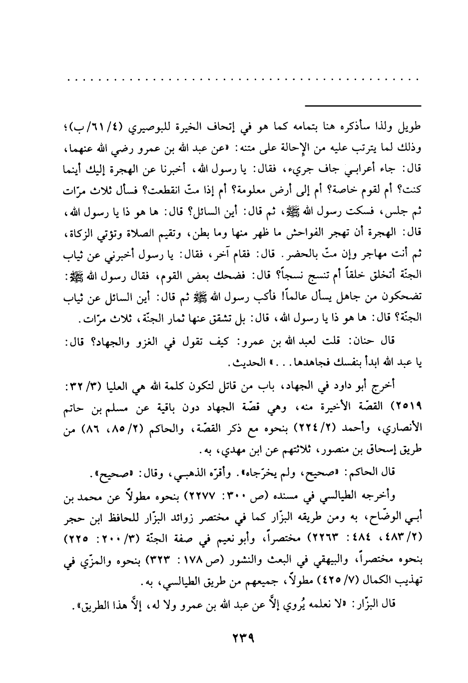 = طويل ولذا سأذكره هنا بتمامه كما هو في إتحاف الخيرة للبوصيري (4/ 61/ ب)؛ وذلك لما يترتب عليه من الإِحالة على متنه: "عَنْ عَبْدِ اللَّهِ بْنِ عَمْرٍو رَضِيَ اللَّهُ عنهما، قال: جاء أعرابي جاف جريء، فقال: يا رسول الله، أخبرنا عن الهجرة إليك أينما كنت؟ أم لقوم خاصة؟ أم إلى أرض معلومة؟ أم إذا متّ انقطعت؟ فسأل ثلاث مرَّات ثم جلس، فَسَكَتَ رَسُولُ اللَّهِ -صَلَّى اللَّهُ عَلَيْهِ وَسَلَّمَ-، ثم قال: أين السائل؟ قال: ها هو ذا يا رسول الله، قال: الهجرة أن تهجر الفواحش ما ظهر منها وما بطن، وتقيم الصلاة وتؤتي الزكاة، ثم أنت مهاجر وإن متّ بالحضر. قال: فقام آخر، فقال: يا رسول أخبرني عن ثياب الجنة أتخلق خلقًا أم تنسج نسجًا؟ قال: فضحك بعض القوم، فَقَالَ رَسُولُ اللَّهِ -صَلَّى اللَّهُ عَلَيْهِ وَسَلَّمَ-: تضحكون من جاهل يسأل عالمًا! فأكب رسول الله -صلى الله عليه وسلم- ثم قال: أين السائل عن ثياب الجنة؟ قال: ها هو ذا يا رسول الله، قال: بل تشقق عنها ثمار الجنة، ثلاث مرَّات.