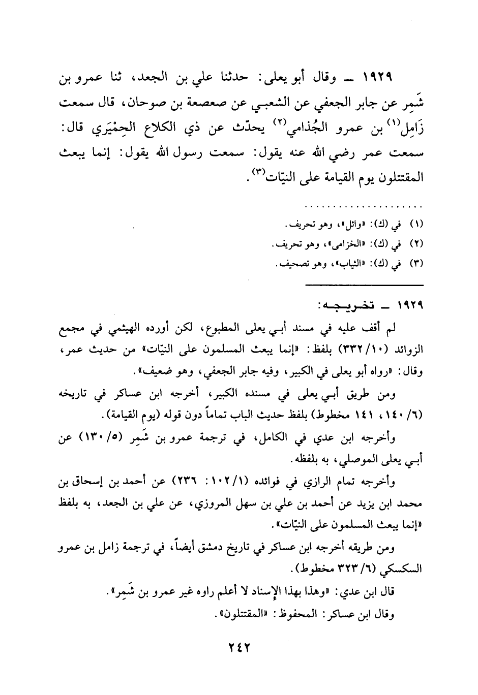 1929 - وَقَالَ أَبُو يَعْلَى حَدَّثَنَا عَلِيُّ بْنُ الْجَعْدِ ثنا عَمْرُو بْنُ شِمْرٍ عَنْ جَابِرٍ الْجُعْفِيِّ عَنِ الشَّعْبِيِّ عَنْ صَعْصَعَةَ بْنِ صَوْحَانَ قَالَ سَمِعْتُ زامِلَ بْنَ عَمْرٍو الْجُذَامِيَّ يُحَدِّثُ عَنْ ذِي الْكَلَاعِ الْحِمْيَرِيِّ قَالَ سَمِعْتُ عُمَرَ رَضِيَ الله عَنْه يَقُولُ سَمِعْتُ رَسُولَ اللَّهِ يَقُولُ §إِنَّمَا يُبْعَثُ الْمُقْتَتِلُونَ يَوْمَ الْقِيَامَةِ عَلَى النِّيَّاتِ