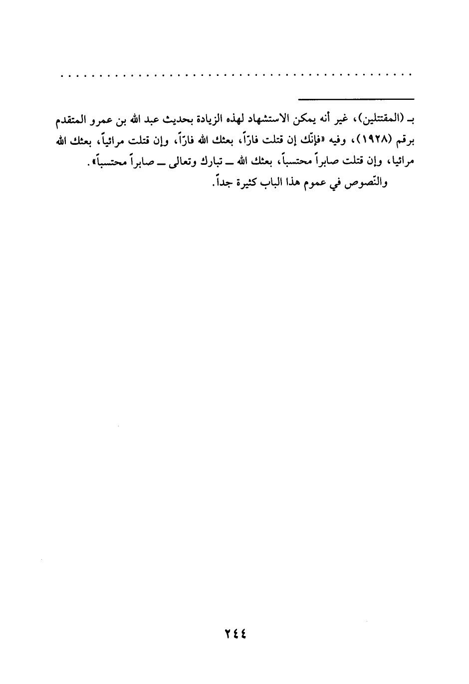= بـ (المقتتلين)، غير أنه يمكن الاستشهاد لهذه الزيادة بحديث عبد الله بن عمرو المتقدم برقم (1928)، وفيه "فَإِنَّكَ إِنْ قُتِلْتَ فَارًّا، بَعَثَكَ اللَّهُ فَارًّا، وإن قتلت مرائيًا، بعثك الله مُرَائِيًا، وَإِنْ قُتِلْتَ صَابِرًا مُحْتَسِبًا، بَعَثَكَ اللَّهُ -تبارك وتعالى- صابرًا محتسبًا".