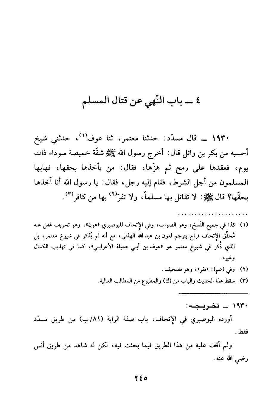 1930 - قَالَ مُسَدَّدٌ حَدَّثَنَا معتمر ثنا اعوف حَدَّثَنِي شَيْخٌ أَحْسَبُهُ مِنْ بَكْرِ بْنِ وَائِلٍ قَالَ أَخْرَجَ رَسُولُ اللَّهِ صَلَّى اللَّهُ عَلَيْهِ وَسَلَّمَ شُقَّةَ خَمِيصَةٍ سَوْدَاءَ ذَاتَ يَوْمٍ فَعَقَدَهَا عَلَى رُمْحٍ ثُمَّ هَزَّهَا فَقَالَ مَنْ يَأْخُذُهَا بِحَقِّهَا فَهَابَهَا الْمُسْلِمُونَ مِنْ أَجْلِ الشَّرْطِ فَقَامَ إِلَيْهِ رَجُلٌ فَقَالَ يَا رَسُولَ اللَّهِ أَنَا آخُذُهَا بِحَقِّهَا قَالَ صَلَّى اللَّهُ عَلَيْهِ وَسَلَّمَ §لَا تُقَاتِلُ بِهَا مُسْلِمًا وَلَا تَفِرُّ بِهَا مِنْ كَافِرٍ