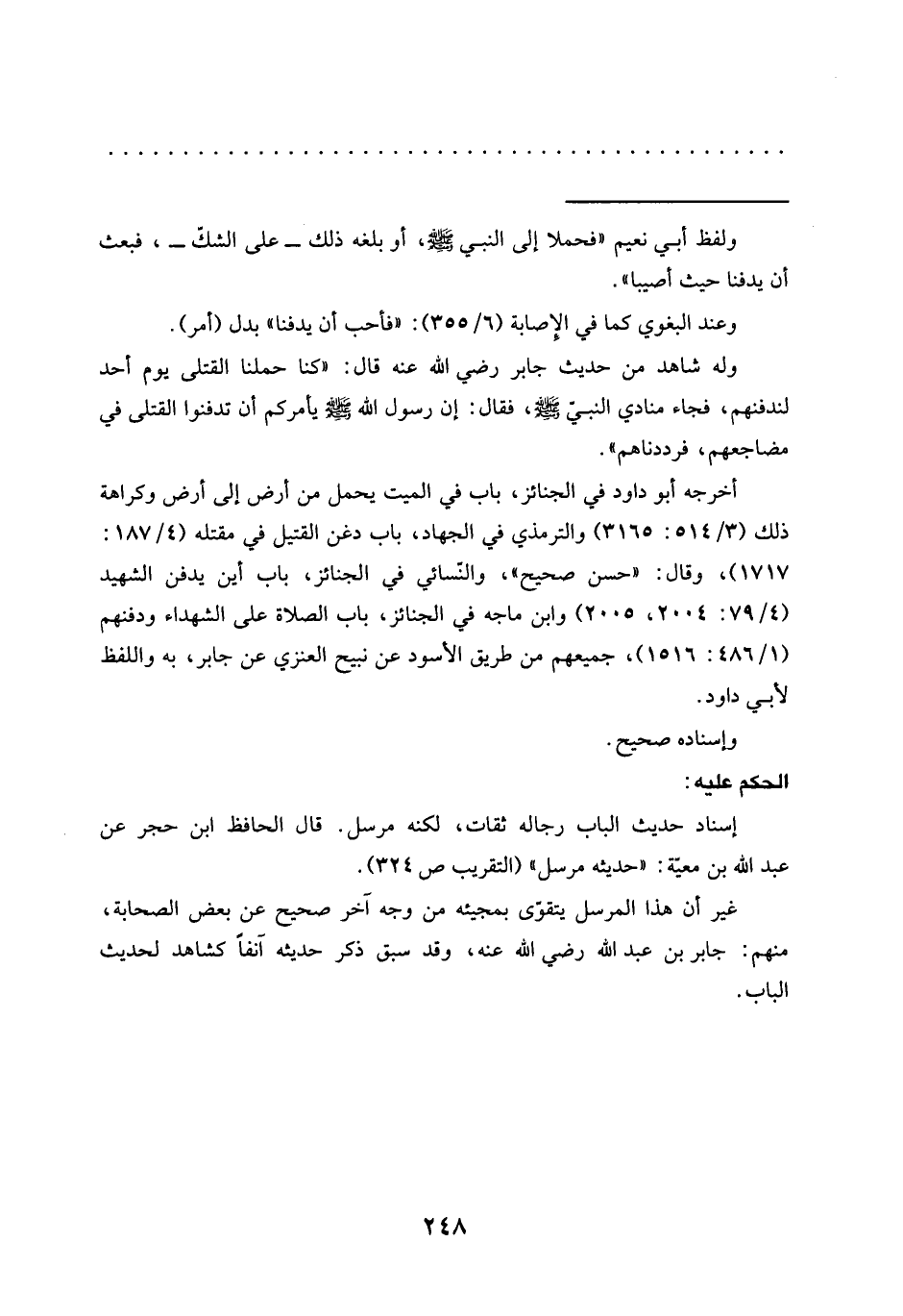 أخرجه أبو داود في الجنائز، باب في الميت يحمل من أرض إلى أرض وكراهة ذلك (3/ 514: 3165) والترمذي في الجهاد، باب دغن القتيل في مقته (4/ 187: 1717)، وقال: "حسن صحيح"، والنّسائي في الجنائز، باب أين يدفن الشهيد (4/ 79: 2004، 2005) وابن ماجه في الجنائز، باب الصلاة على الشهداء ودفنهم (1/ 486: 1516)، جميعهم من طريق الأسود عن نبيح العنزي عن جابر، به واللفظ لأبي داود.