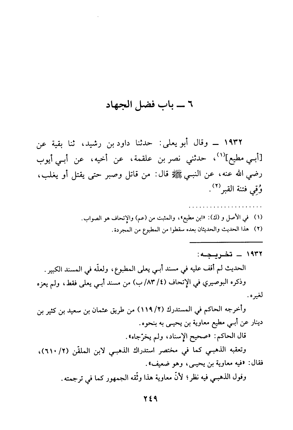 1932 - وَقَالَ أَبُو يَعْلَى حَدَّثَنَا دَاوُدُ بْنُ رُشَيْدٍ ثنا بَقِيَّةُ عَنِ أَبِي مُطِيعٍ حَدَّثَنِي نَصْرُ بْنُ عَلْقَمَةَ عَنْ أَخِيهِ عَنْ أَبِي أَيُّوبَ رَضِيَ الله عَنْه عَنِ النَّبِيِّ صَلَّى اللَّهُ عَلَيْهِ وَسَلَّمَ قَالَ §مَنْ قَاتَلَ وَصَبَرَ حَتَّى يُقْتَلَ أَوْ يَغْلِبَ وُقِيَ فِتْنَةَ الْقَبْرِ