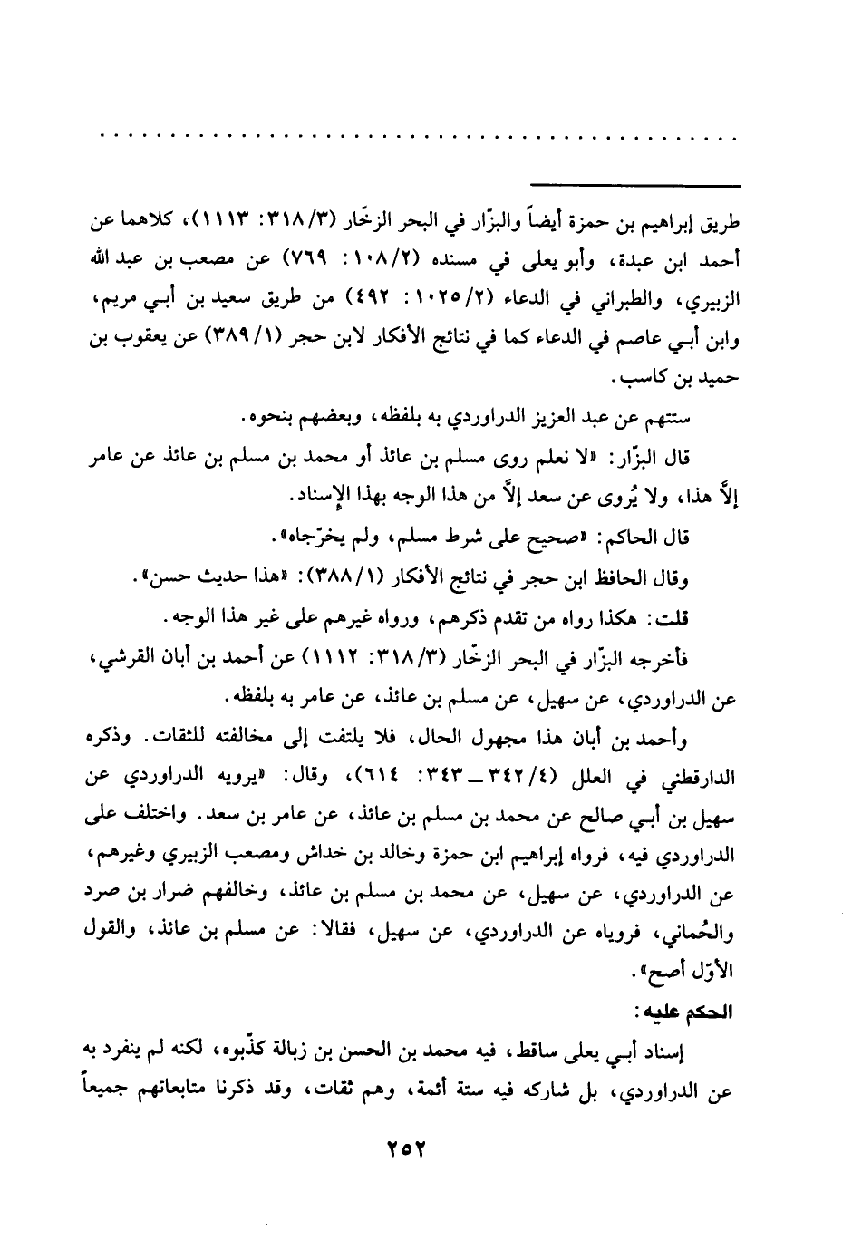 وأحمد بن أبان هذا مجهول الحال، فلا يلتفت إلى مخالفته للثقات. وذكره الدارقطني في العلل (4/ 342 - 343: 614)، وقال: "يرويه الدراوردي عَنْ سُهَيْلِ بْنِ أَبِي صَالِحٍ عَنْ محمَّد بْنِ مُسْلِمِ بْنِ عَائِذٍ، عَنْ عَامِرِ بْنِ سعد. واختلف على الدراوردي فيه، فرواه إبراهيم ابن حمزة وخالد بن خداش ومصعب الزبيري وغيرهم، عن الدراوردي، عن سهيل، عن محمَّد بن مسلم بن عائذ، وخالفهم ضرار بن صرد والحُماني، فروياه عن الدراوردي، عن سهيل، فقالا: عن مسلم بن عائذ، والقول الأول أصح".