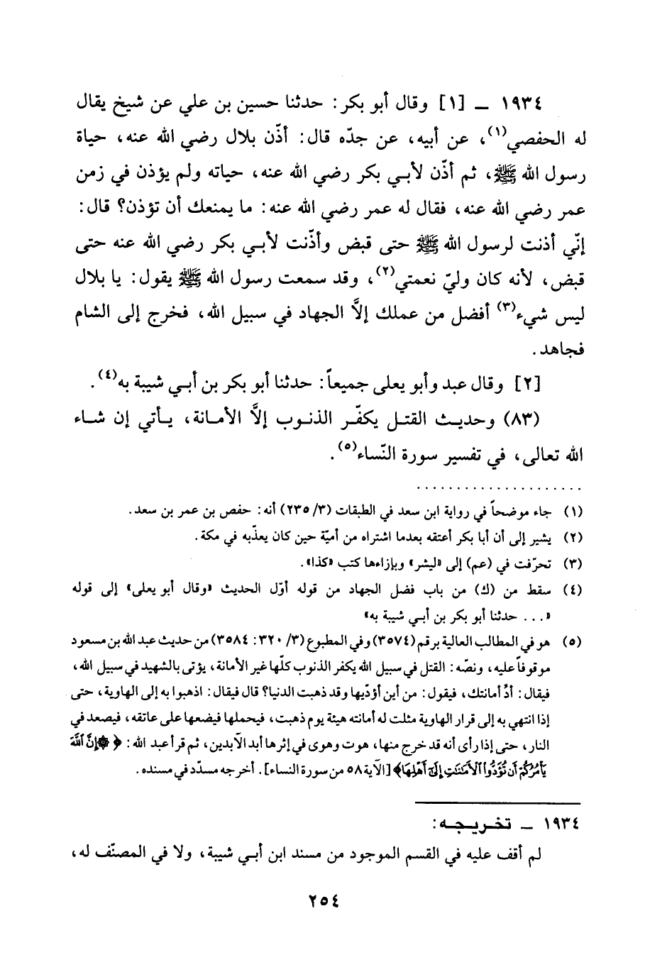 1934 - وَقَالَ أَبُو بَكْرٍ حَدَّثَنَا حُسَيْنُ بْنُ عَلِيٍّ عَنْ شَيْخٍ يُقَالُ لَهُ الْحَفْصِيُّ عَنْ أَبِيهِ عَنْ جَدِّهِ قَالَ أَذَّنَ بِلَالٌ رَضِيَ الله عَنْه حَيَاةَ رَسُولِ اللَّهِ صَلَّى اللَّهُ عَلَيْهِ وَسَلَّمَ ثُمَّ أَذَّنَ لِأَبِي بَكْرٍ رَضِيَ الله عَنْه حَيَاتَهُ وَلَمْ يُؤَذِّنْ فِي زَمَنِ عُمَرَ رَضِيَ الله عَنْه فَقَالَ لَهُ عُمَرُ رَضِيَ الله عَنْه مَا يَمْنَعُكَ أَنْ تُؤَذِّنَ قَالَ إِنِّي أَذَّنْتُ لِرَسُولِ اللَّهِ صَلَّى اللَّهُ عَلَيْهِ وَسَلَّمَ حَتَّى قُبِضَ وَأَذَّنْتُ لِأَبِي بَكْرٍ رَضِيَ الله عَنْه حَتَّى قُبِضَ لِأَنَّهُ كَانَ وَلِيَّ نِعْمَتِي وَقَدْ سَمِعْتُ رَسُولَ اللَّهِ صَلَّى اللَّهُ عَلَيْهِ وَسَلَّمَ يَقُولُ يَا بلال §ليس شَيْءٌ أَفْضَلَ مِنْ عَمَلِكَ إِلَّا الْجِهَادَ فِي سَبِيلِ اللَّهِ فَخَرَجَ إِلَى الشَّامِ فَجَاهَدَ