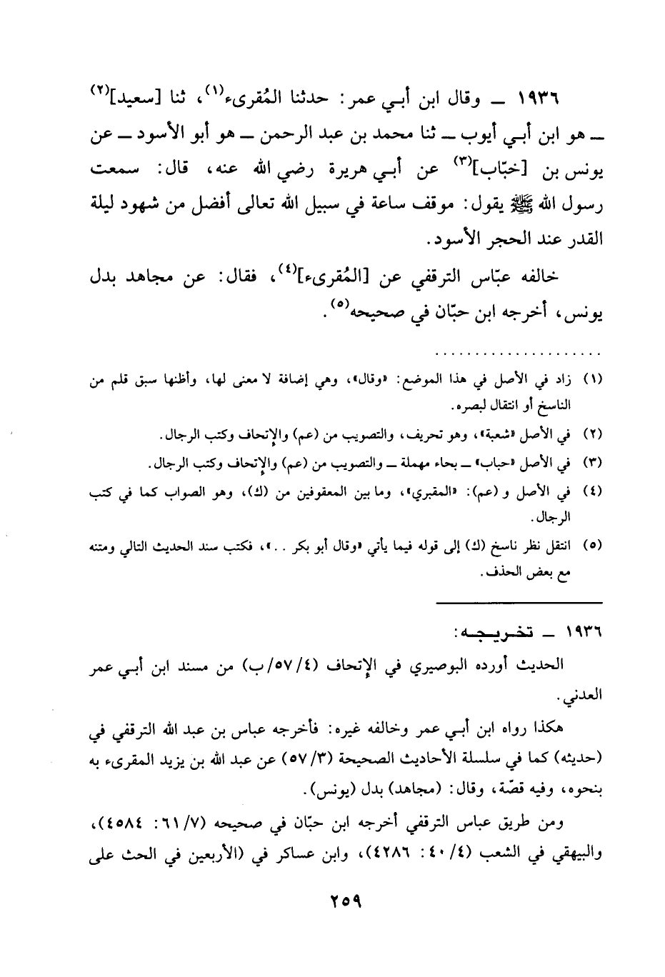 1936 - وَقَالَ ابْنُ أَبِي عُمَرَ حَدَّثَنَا الْمُقْرِئُ ثنا سَعِيدُ هُوَ ابْنُ أَبِي أَيُّوبَ ثنا محمد ابن أبى أيوب ثنا مُحَمَّدُ بْنُ عَبْدِ الرَّحْمَنِ هُوَ أَبُو الْأَسْوَدِ عَنْ يُونُسَ بْنِ خَبَّابٍ عَنْ أَبِي هُرَيْرَةَ رَضِيَ الله عَنْه قَالَ سَمِعْتُ رَسُولَ اللَّهِ صَلَّى اللَّهُ عَلَيْهِ وَسَلَّمَ يَقُولُ §مَوْقِفُ سَاعَةٍ فِي سَبِيلِ اللَّهِ تَعَالَى أَفْضَلُ مِنْ شُهُودِ لَيْلَةِ الْقَدْرِ عِنْدَ الْحَجَرِ الْأَسْوَدِ خَالَفَهُ عَبَّاسٌ التَّرْقُفِيُّ عَنِ المقرىء فَقَالَ عَنْ مُجَاهِدٍ بَدَلَ يُونُسَ أَخْرَجَهُ ابْنُ حِبَّانَ فِي صَحِيحِهِ