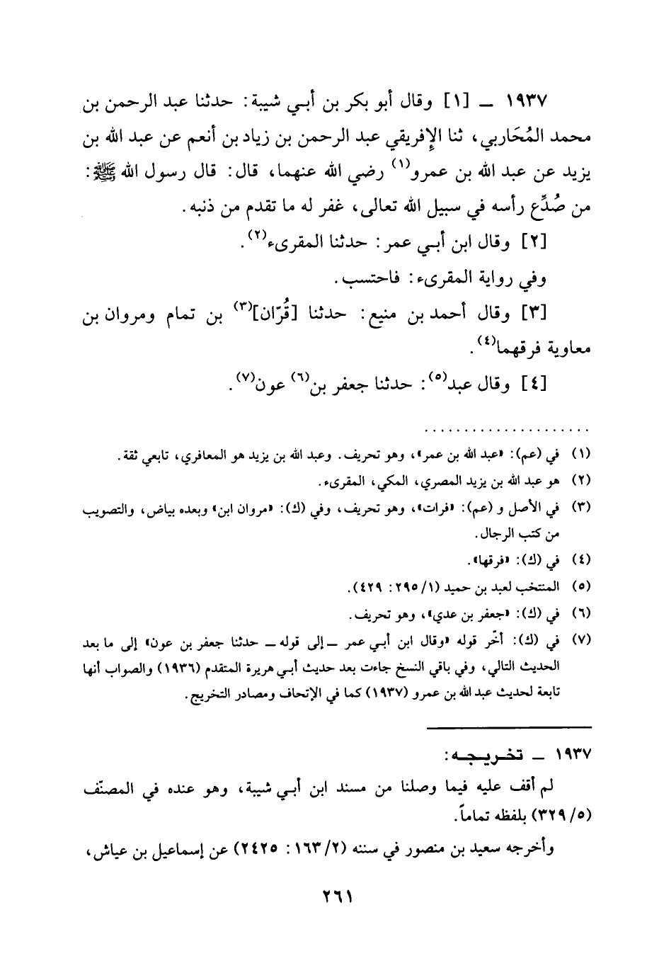 1937 - وَقَالَ أَبُو بَكْرِ بْنُ أَبِي شَيْبَةَ حَدَّثَنَا عَبْدُ الرَّحْمَنِ بْنُ مُحَمَّدٍ الْمُحَارِبِيُّ ثناالأفريقي عَبْدُ الرَّحْمَنِ بْنِ زِيَادِ بْنِ أَنْعَمَ عَنْ عَبْدِ اللَّهِ بْنِ يَزِيدَ عَنْ عَبْدِ اللَّهِ بن عمرو رَضِيَ الله عَنْهما قَالَ قَالَ رَسُولُ اللَّهِ صَلَّى اللَّهُ عَلَيْهِ وَسَلَّمَ §مَنْ صُدِعَ رَأْسُهُ فِي سبيل الله تعالى غَفَرَ لَهُ مَا تَقَدَّمَ مِنْ ذَنْبِهِ