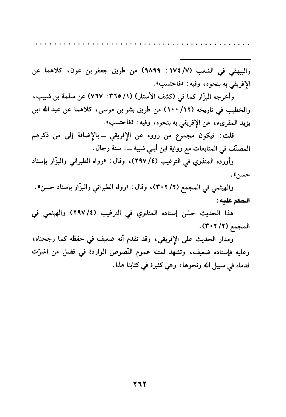 ومدار الحديث على الإفريقي، وقد تقدم أنه ضعيف في حفظه كما رجحناه، وعليه فإسناده ضعيف، وتشهد لمتنه عموم النّصوص الواردة في فضل من اغبرّت قدماه في سبيل الله ونحوها، وهي كثيرة في كتابنا هذا.