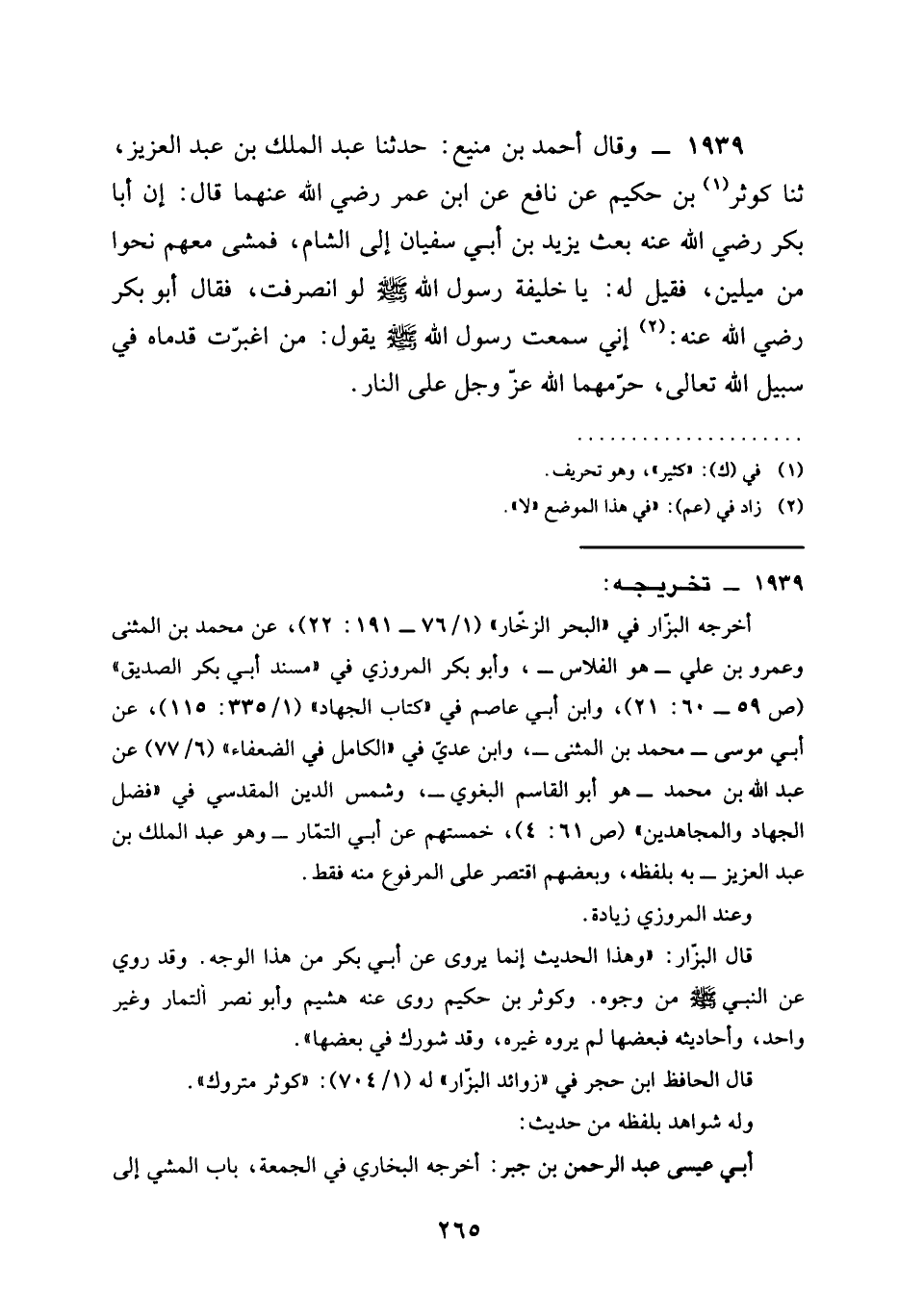 وَقَالَ أَحْمَدُ بْنُ مَنِيعٍ حَدَّثَنَا عَبْدُ الْمَلِكِ بْنُ العزيز ثنا كوثر بْنُ حَكِيمٍ عَنْ نَافِعٍ عَنِ ابن عمر رَضِيَ الله عَنْهما قال أَنَّ أَبَا بَكْرٍ رَضِيَ الله عَنْه بَعَثَ يَزِيدَ بْنِ أَبِي سُفْيَانَ إِلَى الشَّامِ فَمَشَى مَعَهُمْ نَحْوًا مِنْ مِيلَيْنِ فَقِيلَ لَهُ يَا خَلِيفَةَ رَسُولِ اللَّهِ صَلَّى اللَّهُ عَلَيْهِ وَسَلَّمَ لَوِ انْصَرَفْتَ فَقَالَ أَبُو بَكْرٍ رَضِيَ الله عَنْه إِنِّي سَمِعْتُ رَسُولَ اللَّهِ صَلَّى اللَّهُ عَلَيْهِ وَسَلَّمَ يَقُولُ §مَنِ اغْبَرَّتْ قَدَمَاهُ فِي سبيل الله تعالى حرمهما الله عز وجل عَلَى النَّارِ