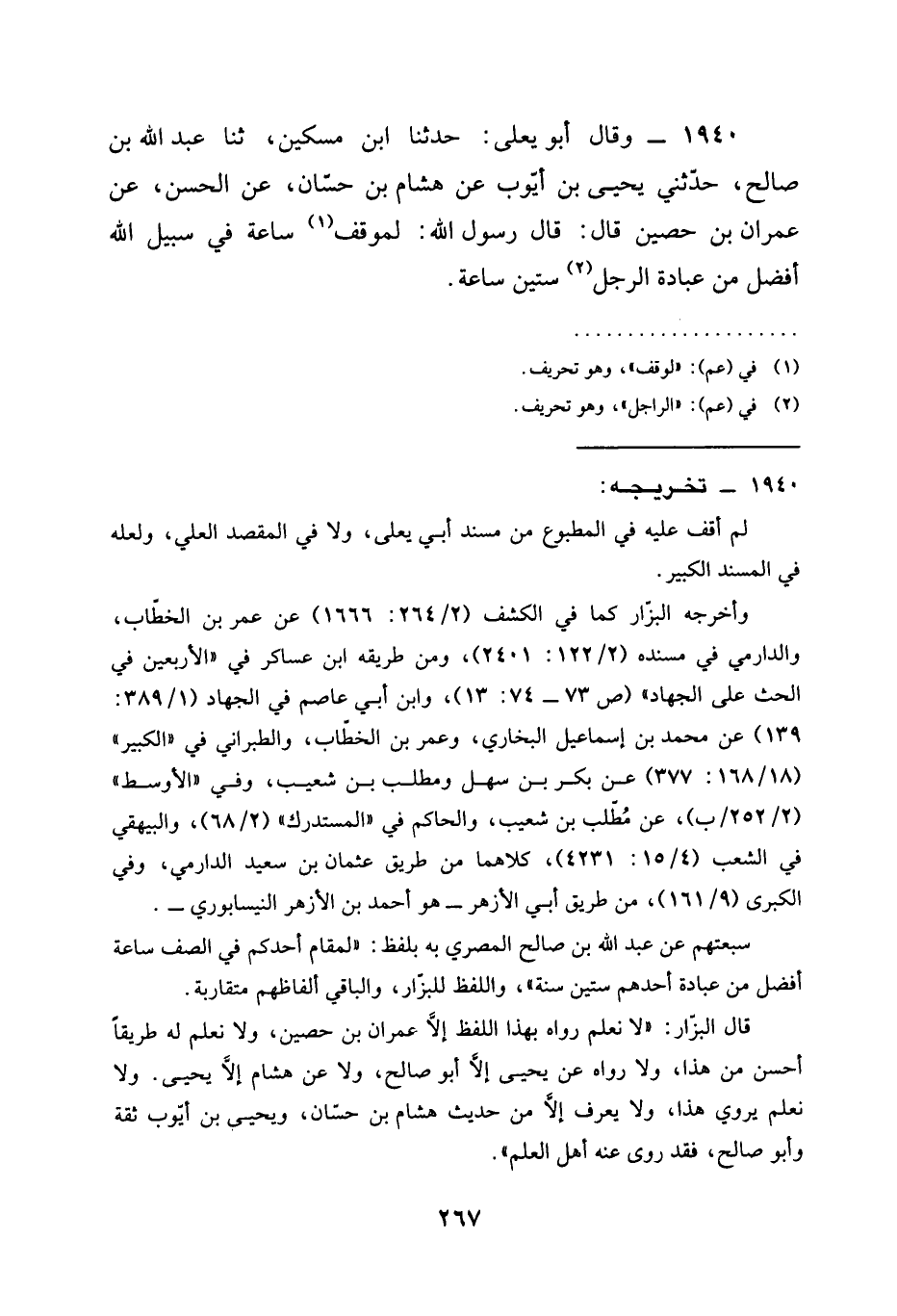 1940 - وَقَالَ أَبُو يَعْلَى حَدَّثَنَا ابْنُ مِسْكِينٍ ثنا عَبْدُ اللَّهِ بْنُ صَالِحٍ حَدَّثَنِي يَحْيَى بْنُ أَيُّوبَ عَنْ هِشَامِ بْنِ حَسَّانَ عَنِ الْحَسَنِ عَنْ عِمْرَانَ بْنِ حُصَيْنٍ قَالَ قَالَ رَسُولُ اللَّهِ §لَمَوْقِفُ سَاعَةٍ فِي سَبِيلِ اللَّهِ أَفْضَلُ مِنْ عِبَادَةِ الرجل ستين ساعة