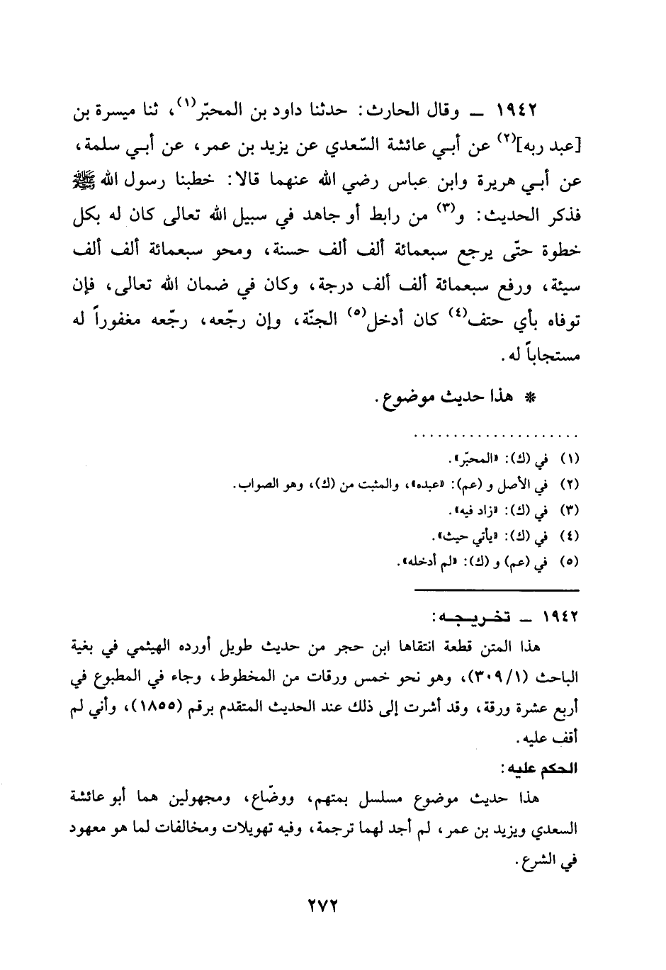 1942 - وَقَالَ الْحَارِثُ حَدَّثَنَا دَاوُدُ بْنُ الْمُحَبَّرِ ثنا مَيْسَرَةُ بْنُ عَبْدِ رَبِّهِ عَنْ أَبِي عَائِشَةَ السَّعْدِيِّ عَنْ يزيد بن عمر عَنْ أَبِي سَلَمَةَ عَنْ أَبِي هُرَيْرَةَ وابن عباس رَضِيَ الله عَنْهما قالا خَطَبَنَا رَسُولُ اللَّهِ صَلَّى اللَّهُ عَلَيْهِ وَسَلَّمَ فَذَكَرَ الْحَدِيثَ §وَمَنْ رَابَطَ أَوْ جَاهَدَ فِي سبيل الله تعالى كَانَ لَهُ بِكُلِّ خُطْوَةٍ حَتَّى يَرْجِعَ سَبْعُمِائَةِ ألف ألف حسنة وَمَحْوُ سَبْعُمِائَةِ أَلْفِ أَلْفِ سَيِّئَةٍ وَرَفْعُ سَبْعُمِائَةِ أَلْفِ أَلْفِ دَرَجَةٍ وَكَانَ فِي ضَمَانِ اللَّهِ تعالى فَإِنْ تَوَفَّاهُ بأي حتف كان ادخل الجنة وان رجعه رجعه مَغْفُورًا لَهُ مُسْتَجَابًا لَهُ