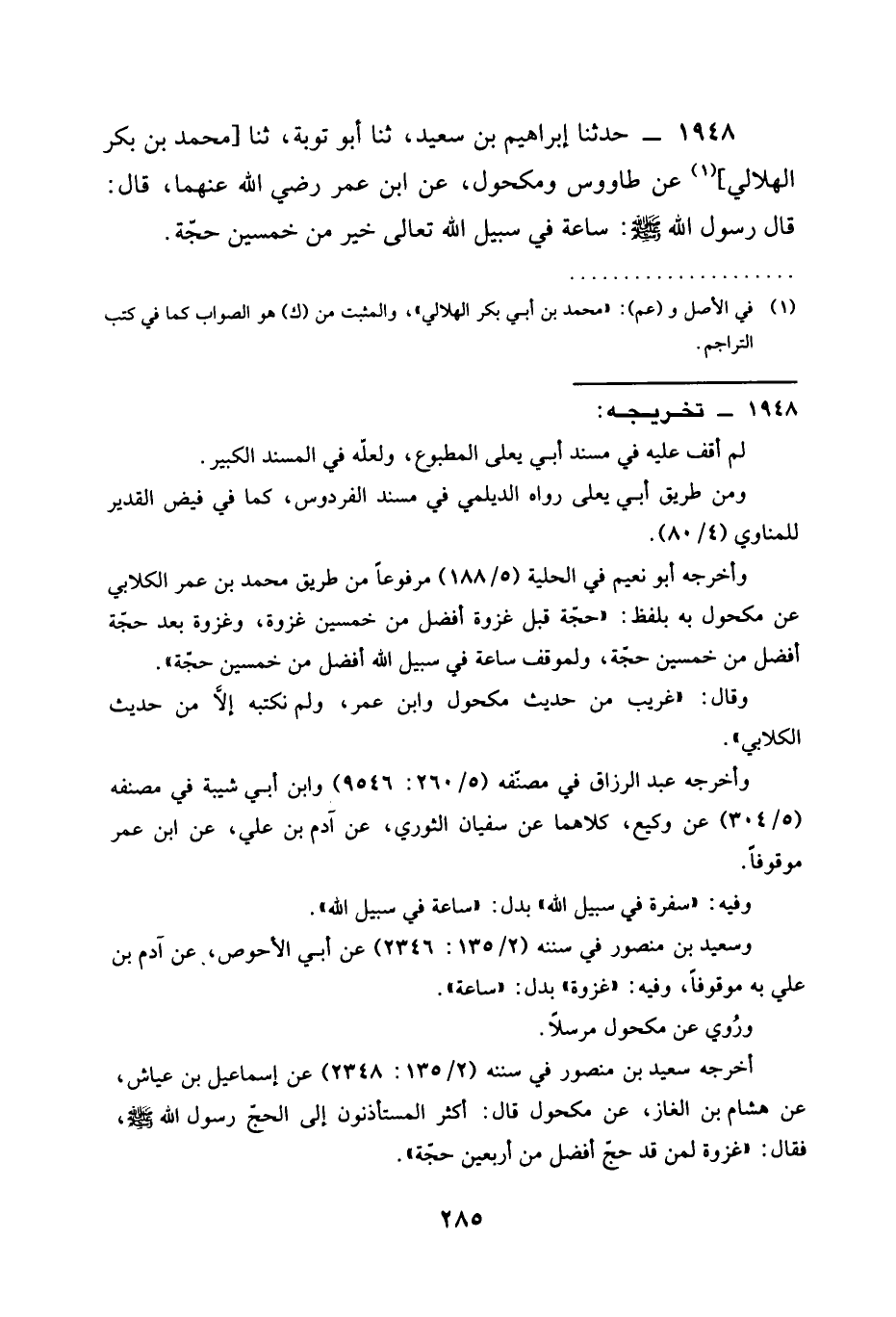 1948 - حَدَّثَنَا إِبْرَاهِيمُ بْنُ سَعِيدٍ ثنا أَبُو تَوْبَةَ ثنا مُحَمَّدُ بْنُ بَكْرٍ الهلالي عَنْ طاووس وَمَكْحُولٍ عَنِ ابن عمر رَضِيَ الله عَنْهما قَالَ قَالَ رَسُولُ اللَّهِ صَلَّى اللَّهُ عَلَيْهِ وَسَلَّمَ §سَاعَةٌ فِي سبيل الله تعالى خَيْرٌ مِنْ خَمْسِينَ حَجَّةً