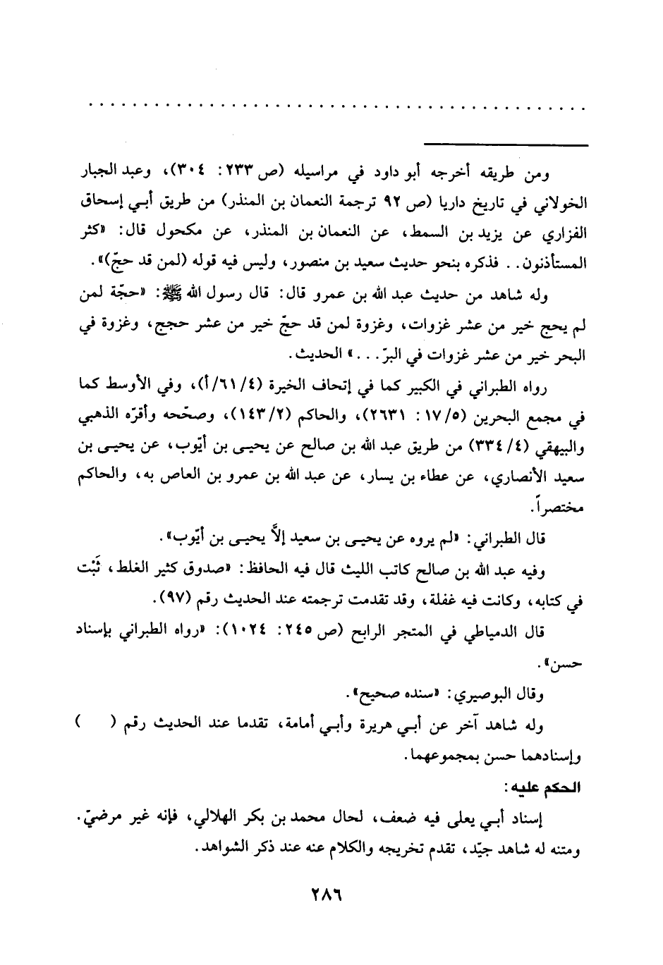 = ومن طريقه أخرجه أبو داود في مراسيله (ص 233: 304)، وعبد الجبار الخولاني في تاريخ داريا (ص 92 ترجمة النعمان بن المنذر) من طريق أبي إسحاق الفزاري عن يزيد بن السمط، عن النعمان بن المنذر، عن مكحول قال: "كثر المستأذنون .. فذكره بنحو حديث سعيد بن منصور، وليس فيه قوله (لمن قد حجّ) ".