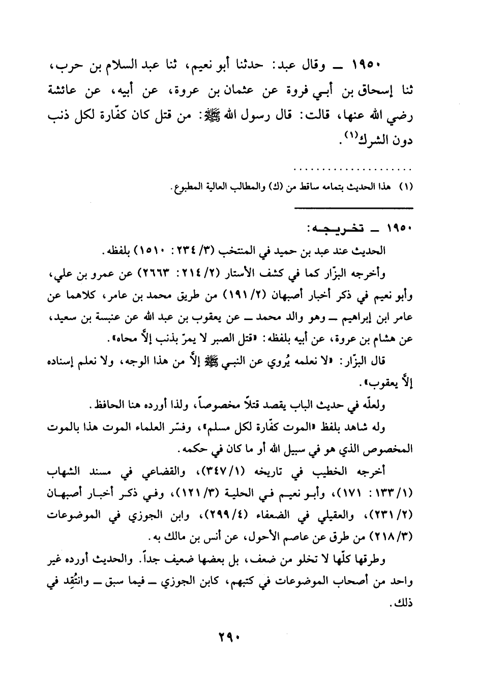 1950 - وَقَالَ عبد حدثنا أبو نعيم ثنا عَبْدُ السَّلَامِ بْنُ حَرْبٍ ثنا إِسْحَاقُ بْنُ أَبِي فَرْوَةَ عَنْ عُثْمَانَ بْنِ عُرْوَةَ عَنْ أَبِيهِ عن عائشة رَضِيَ الله عَنْها قَالَتْ قَالَ رَسُولُ اللَّهِ صَلَّى اللَّهُ عَلَيْهِ وَسَلَّمَ §مَنْ قُتِلَ كَانَ كَفَّارَةً لِكُلِّ ذَنْبٍ دُونَ الشِّرْكِ