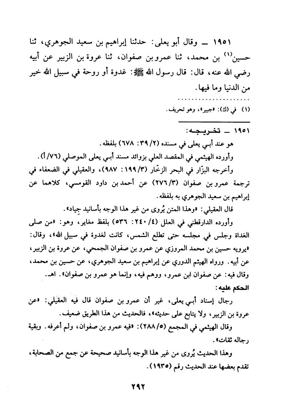 1951 - وَقَالَ أَبُو يَعْلَى حَدَّثَنَا إِبْرَاهِيمُ بْنُ سَعِيدٍ الْجَوْهَرِيُّ ثنا حُسَيْنُ بْنُ مُحَمَّدٍ ثنا عَمْرُو بْنُ صَفْوَانَ ثنا عُرْوَةُ بْنُ الزُّبَيْرِ عَنْ أَبِيهِ رَضِيَ الله عَنْه قَالَ قَالَ رَسُولُ اللَّهِ صَلَّى اللَّهُ عَلَيْهِ وَسَلَّمَ §غَدْوَةٌ أَوْ رَوْحَةٌ فِي سَبِيلِ اللَّهِ خَيْرٌ مِنَ الدُّنْيَا وَمَا فِيهَا