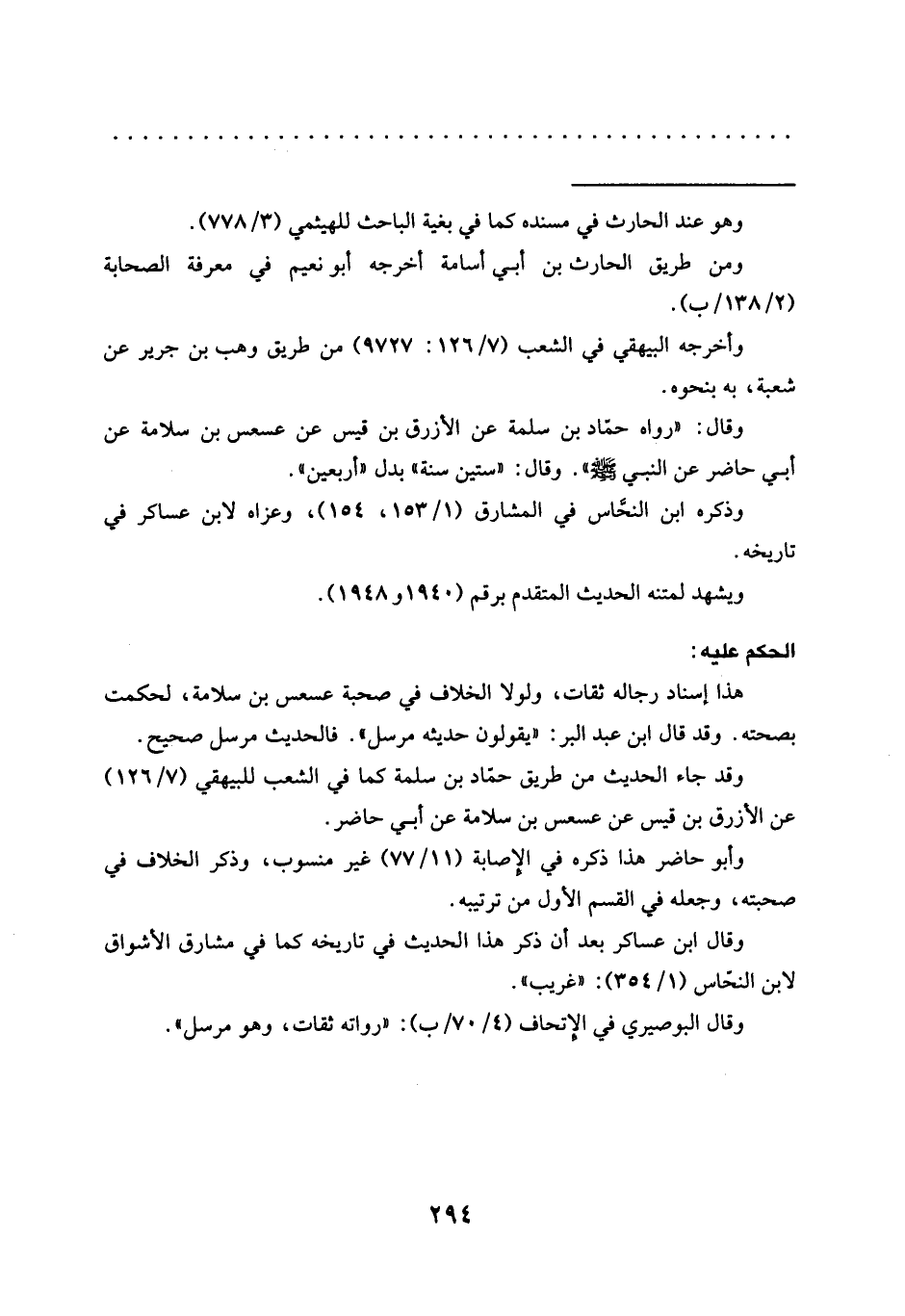 وقد جاء الحديث من طريق حمّاد بن سلمة كما في الشعب للبيهقي (7/ 126) عَنِ الْأَزْرَقِ بْنِ قَيْسٍ عَنْ عَسْعَسِ بْنِ سلامة عن أبي حاضر.