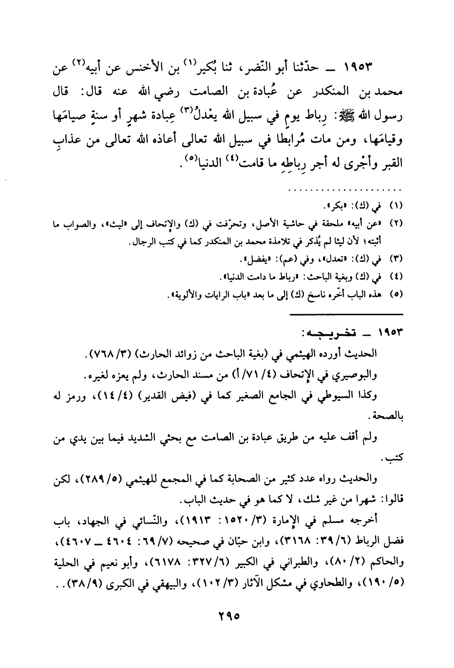 1953 - حَدَّثَنَا أَبُو النَّضْرِ ثنا بَكْيرُ بْنُ الأخنس عَنْ أبيه عَنْ مُحَمَّدِ بْنِ الْمُنْكَدِرِ عَنْ عُبَادَةَ بْنِ الصَّامِتِ رَضِيَ الله عَنْه قَالَ قَالَ رَسُولُ اللَّهِ صَلَّى اللَّهُ عَلَيْهِ وَسَلَّمَ §رِبَاطُ يَوْمٍ فِي سَبِيلِ اللَّهِ يعْدِلُ عِبَادَةَ شَهْرٍ أَوْ سَنَةٍ صِيَامَهَا وَقِيَامَهَا وَمَنْ مَاتَ مُرَابِطًا فِي سَبِيلِ اللَّهِ تعالى أَعَاذَهُ اللَّهُ تعالى مِنْ عَذَابِ الْقَبْرِ وَأَجْرَى لَهُ أَجْرَ رِبَاطِهِ مَا قامَتِ الدُّنْيَا