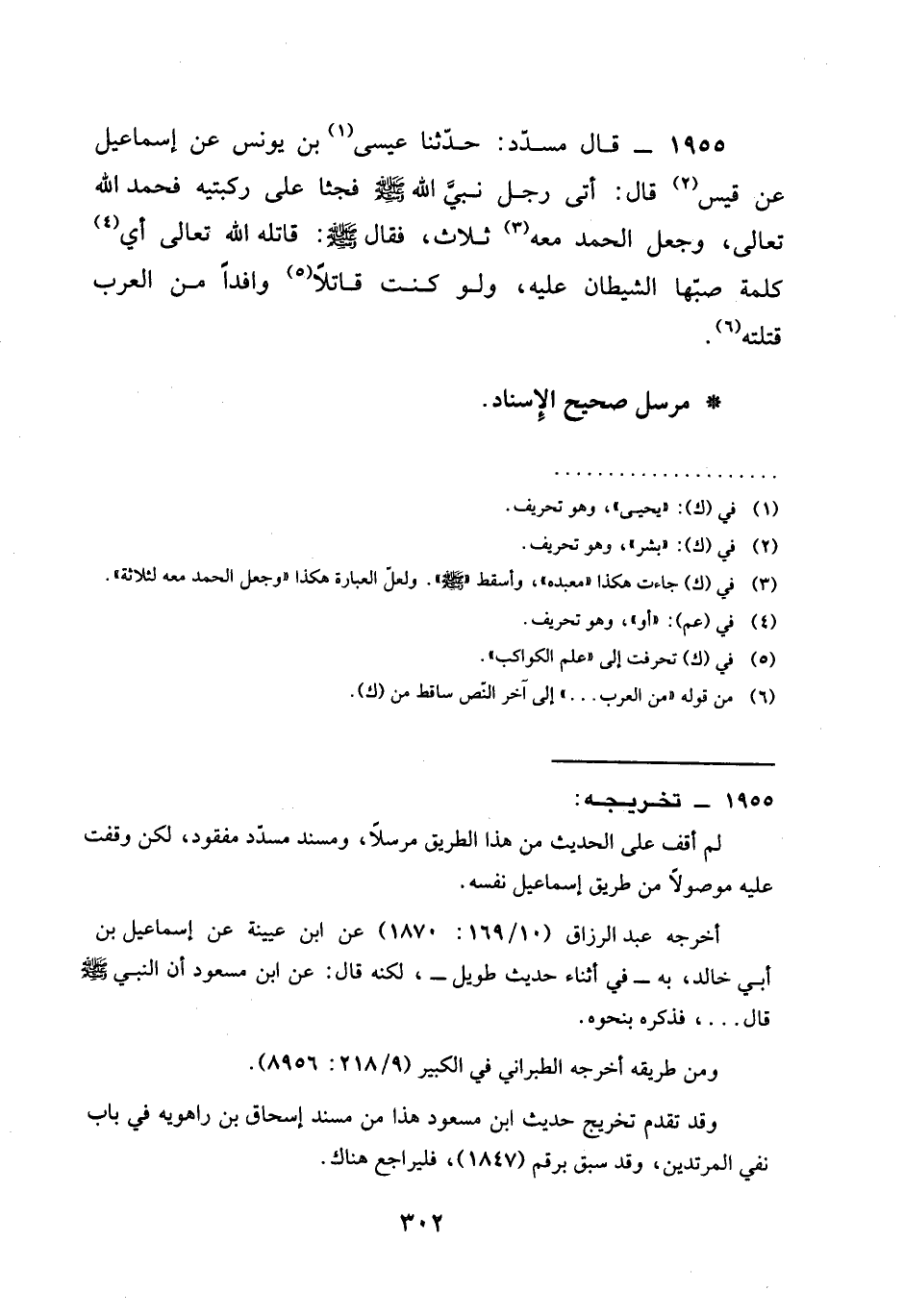 1955 - قَالَ مُسَدَّدٌ حَدَّثَنَا عِيسَى بْنُ يُونُسَ عَنْ إِسْمَاعِيلَ عَنْ قَيْسٍ قَالَ أَتَى رَجُلٌ نبي الله صَلَّى اللَّهُ عَلَيْهِ وَسَلَّمَ فحثا عَلَى رُكْبَتَيْهِ فَحَمِدَ اللَّهَ تَعَالَى وَجَعَلَ الْحَمْدَ مَعَهُ ثَلَاث فَقَالَ صَلَّى اللَّهُ عَلَيْهِ وَسَلَّمَ §قَاتَلَهُ اللَّهُ تَعَالَى أَيُّ كَلِمَةٍ صَبَّهَا الشَّيْطَانُ عَلَيْهِ وَلَوْ كُنْتُ قَاتِلًا وَافِدًا مِنَ الْعَرَبِ قَتَلْتُهُ