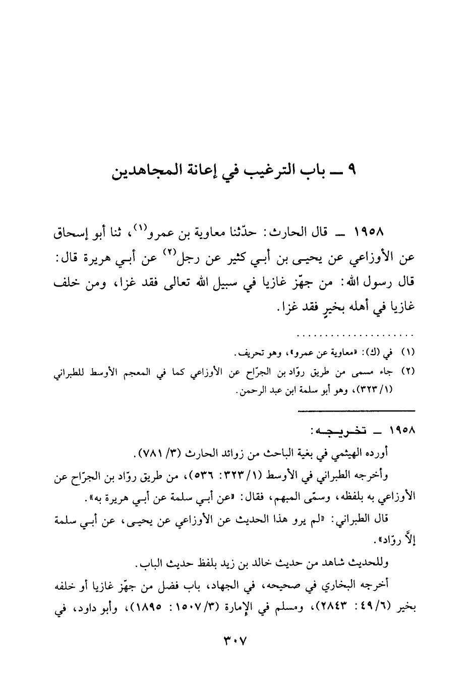 1958 - قَالَ الْحَارِثُ حَدَّثَنَا مُعَاوِيَةُ بْنُ عَمْرٍو ثنا أَبُو إِسْحَاقَ عَنِ الْأَوْزَاعِيِّ عَنْ يَحْيَى بْنِ أَبِي كَثِيرٍ عَنْ رَجُلٍ عَنْ أَبِي هُرَيْرَةَ قَالَ قَالَ رَسُولُ اللَّهِ §مَنْ جَهَّزَ غَازِيًا فِي سَبِيلِ اللَّهِ تعالى فقد عزا ومن خلف غازي فِي أَهْلِهِ بِخَيْرٍ فَقَدْ غَزَا