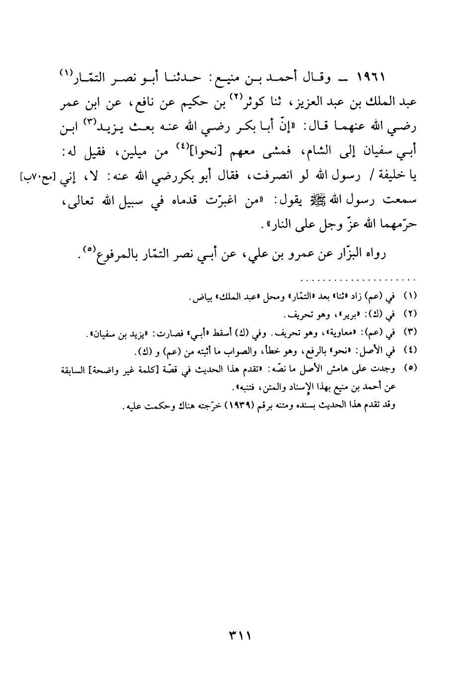 1961 - وَقَالَ أَحْمَدُ بْنُ مَنِيعٍ حَدَّثَنَا أَبُو نَصْرٍ التَّمَّارُ عَبْدُ الْمَلِكِ بْنِ عَبْدِ الْعَزِيزِ ثنا كَوْثَرُ بْنُ حَكِيمٍ عَنْ نَافِعٍ عَنِ ابن عمر رَضِيَ الله عَنْهما قَالَ إِنَّ أَبَا بَكْرٍ رَضِيَ الله عَنْه بَعَثَ يَزِيدَ ابن أَبِي سُفْيَانَ إِلَى الشَّامِ فَمَشَى مَعَهُمْ نَحْوًا مِنْ مِيلَيْنِ فَقِيلَ لَهُ يَا خَلِيفَةَ رَسُولِ اللَّهِ لَوِ انْصَرَفْتَ فَقَالَ أَبُو بَكْرٍ رَضِيَ الله عَنْه لَا إِنِّي سَمِعْتُ رَسُولَ اللَّهِ صَلَّى اللَّهُ عَلَيْهِ وَسَلَّمَ يَقُولُ §مَنِ اغْبَرَّتْ قَدَمَاهُ فِي سَبِيلِ اللَّهِ تَعَالَى حَرَّمَهَما اللَّهُ عَزَّ وَجَلَّ عَلَى النَّارِ