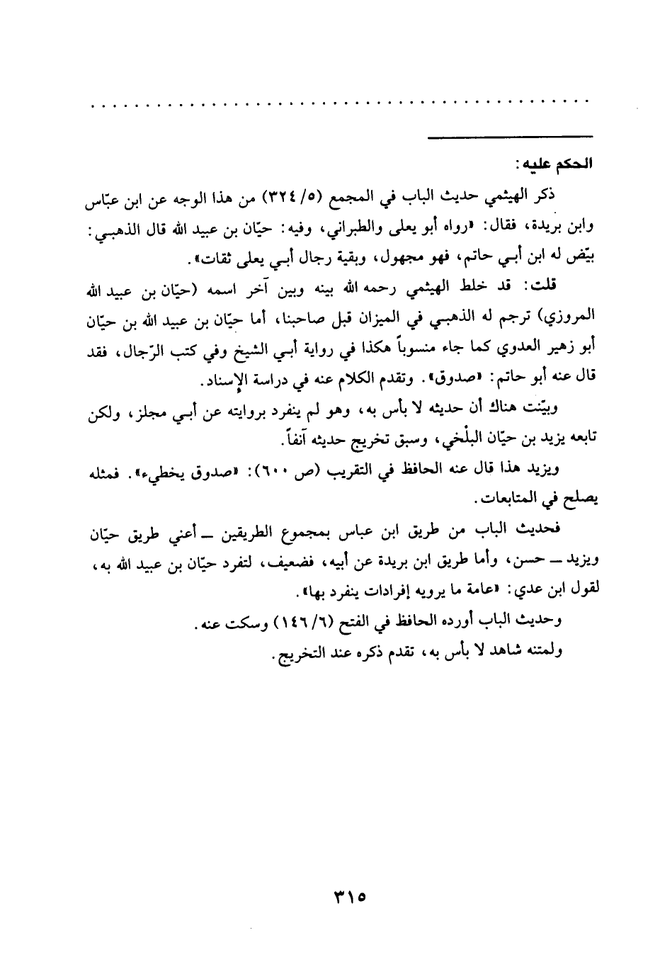 قلت: قد خلط الهيثمي رحمه الله بينه وبين آخر اسمه (حيان بن عبيد الله المروزي) ترجم له الذهبي في الميزان قبل صاحبنا، أما حيان بن عبيد الله بن حيّان أبو زهير العدوي كما جاء منسوبًا هكذا في رواية أبي الشيخ وفي كتب الرّجال، فقد قال عنه أبو حاتم: "صدوق". وتقدم الكلام عنه في دراسة الإسناد.