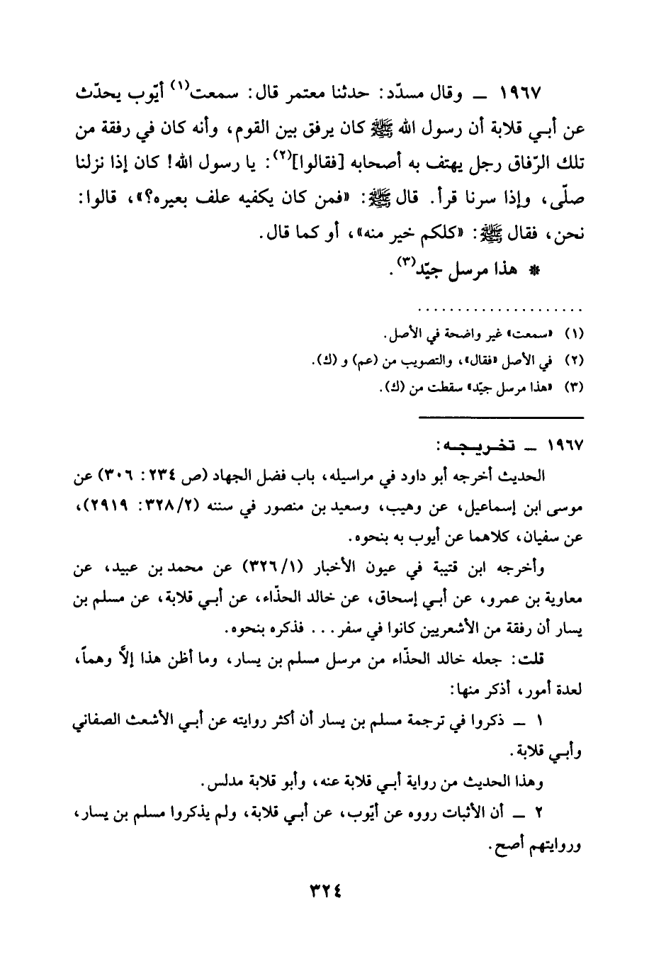 1967 - وَقَالَ مُسَدَّدٌ حَدَّثَنَا مُعْتَمِرٌ قَالَ سَمِعْتُ أَيُّوبَ يُحَدِّثُ عَنْ أَبِي قِلَابَةَ أَنَّ رَسُولَ اللَّهِ صَلَّى اللَّهُ عَلَيْهِ وَسَلَّمَ كَانَ يَرْفُقُ بَيْنَ الْقَوْمِ وَأَنَّهُ كَانَ فِي رُفْقَةٍ مِنْ تِلْكِ الرِّفَاقِ رَجُلٌ يَهْتِفُ بِهِ أَصْحَابُهُ فَقَالُوا يَا رَسُولَ اللَّهِ كَانَ إِذَا نَزَلْنَا صَلَّى وَإِذَا سِرْنَا قَرَأَ قَالَ صَلَّى اللَّهُ عَلَيْهِ وَسَلَّمَ §فَمَنْ كَانَ يَكْفِيهِ عَلَفُ بَعِيرِهِ قَالُوا نَحْنُ فَقَالَ صَلَّى اللَّهُ عَلَيْهِ وَسَلَّمَ كُلُّكُمْ خَيْرٌ مِنْهُ أَوْ كَمَا قَالَ