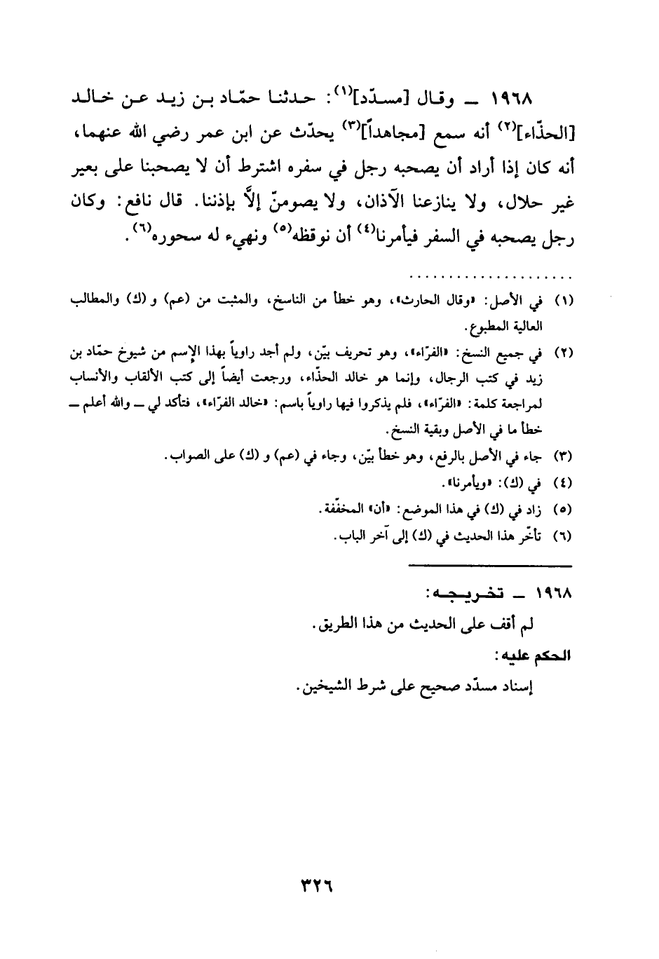 1968 - وَقَالَ مُسَدَّدٌ حَدَّثَنَا حَمَّادُ بْنُ زَيْدٍ عَنْ خَالِدٍ الْحَذِّاءِ أَنَّهُ سَمِعَ مُجَاهِدًا يُحَدِّثُ عَنِ ابن عمر رَضِيَ الله عَنْهما أَنَّهُ كَانَ §إِذَا أَرَادَ أَنْ يَصْحَبَهُ رَجُلٌ فِي سَفَرِهِ اشْتَرَطَ أَنْ يَصْحَبَنَا عَلَى بَعِيرٍ غَيْرِ حَلَالٍ وَلَا يُنَازِعَنَا الْأَذَانَ وَلَا يَصُومَنَّ إِلَّا بِإِذْنِنَا قَالَ نَافِعٌ وَكَانَ رَجُلٌ يَصْحَبُهُ فِي السَّفَرِ فَيَأْمُرُنَا أَنْ نُوقِظَهُ ونهيئ لَهُ سَحُورَهُ