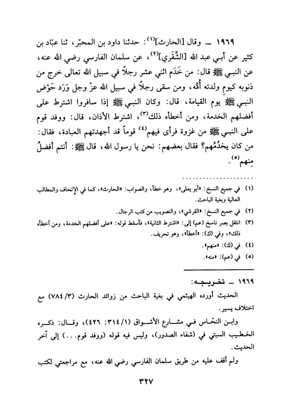 1969 - وَقَالَ الْحَارِثُ حَدَّثَنَا دَاوُدُ بْنُ الْمُحَبَّرِ ثنا عَبَّادُ بْنُ كَثِيرٍ عَنْ أَبِي عَبْدِ اللَّهِ الشَّقْرِيِّ عَنْ سَلْمَانَ الْفَارِسِيِّ رَضِيَ الله عَنْه عَنِ النَّبِيِّ صَلَّى اللَّهُ عَلَيْهِ وَسَلَّمَ قَالَ §مَنْ خَدَمَ اثْنَيْ عَشَرَ رَجُلًا فِي سَبِيلِ اللَّهِ تعالى خَرَجَ مِنْ ذُنُوبِهِ كَيَوْمِ وَلَدَتْهُ أُمُّهُ وَمَنْ سَقَى رَجُلًا فِي سَبِيلِ اللَّهِ عز وجل وَرِدَ حَوْضَ النَّبِيِّ صَلَّى اللَّهُ عَلَيْهِ وَسَلَّمَ يَوْمَ الْقِيَامَةِ قَالَ وكَانَ النَّبِيُّ صَلَّى اللَّهُ عَلَيْهِ وَسَلَّمَ إِذَا سَافَرُوا اشْتَرَطَ عَلَى أَفْضَلِهِمُ الْخِدْمَةَ وَمَنْ أخطاءه ذَلِكَ اشْتَرَطَ الْأَذَانَ قَالَ وَوَفَدَ قَوْمٌ عَلَى النبي صَلَّى اللَّهُ عَلَيْهِ وَسَلَّمَ من عزوة فَرَأَى فيهم قَوْمًا قَدْ أَجْهَدَتْهُمُ الْعِبَادَةُ فَقَالَ مَنْ كَانَ يَخْدِمُهُمْ فَقَالَ بَعْضُهُمْ نَحْنُ يَا رَسُولَ اللَّهِ قَالَ صَلَّى اللَّهُ عَلَيْهِ وَسَلَّمَ أَنْتُمْ أَفْضَلُ مِنْهُمْ