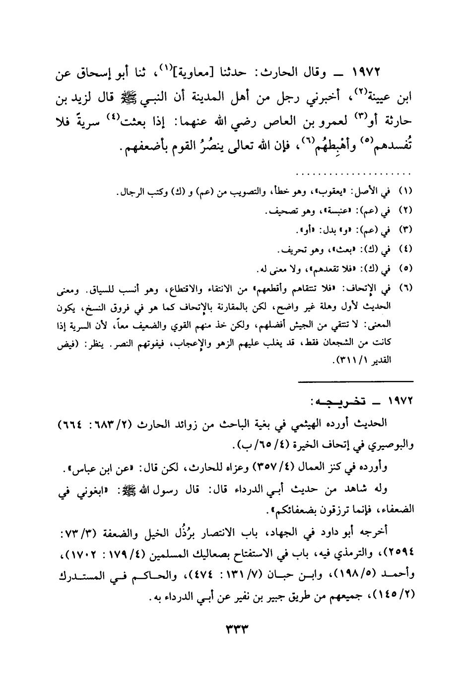 1972 - وَقَالَ الْحَارِثُ حَدَّثَنَا مُعَاوِيَةُ ثنا أَبُو إِسْحَاقَ عَنِ ابْنِ عُيَيْنَةَ أَخْبَرَنِي رَجُلٌ مِنْ أَهْلِ الْمَدِينَةِ أَنَّ النَّبِيَّ صَلَّى اللَّهُ عَلَيْهِ وَسَلَّمَ قَالَ لِزَيْدِ بْنِ حَارِثَةَ أَوْ لِعَمْرِو بْنِ الْعَاصِ رَضِيَ الله عَنْهما §إِذَا بَعَثْتَ سَرِيَّةً فَلَا تفسدهُمْ وَأَهْبِطْهُمْ فَإِنَّ اللَّهَ تعالى يَنْصُرُ الْقَوْمَ بِأَضْعَفِهِمْ