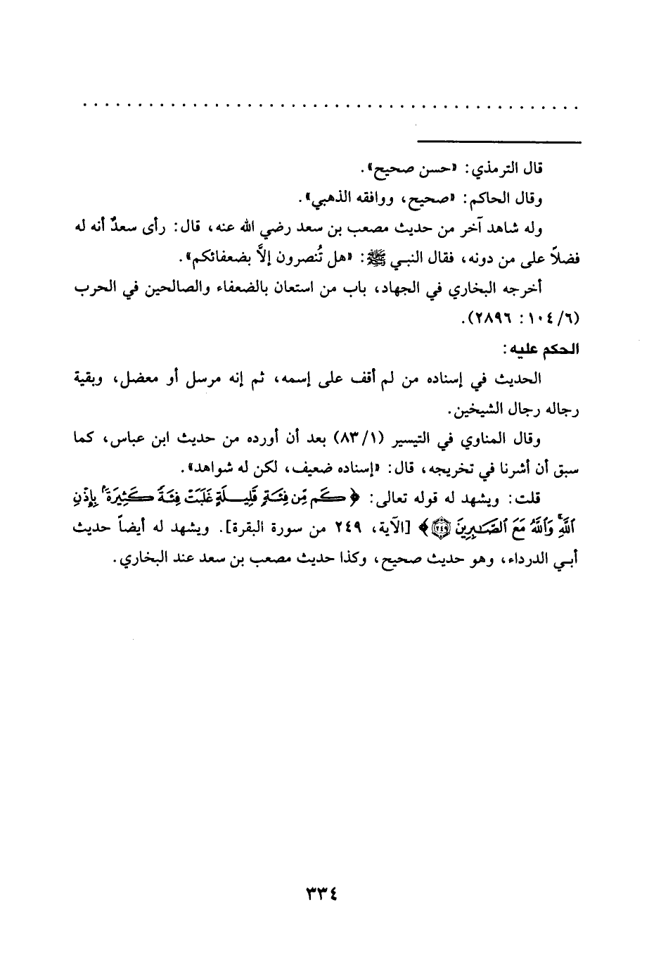 قلت: ويشهد له قوله تعالى: {كَمْ مِنْ فِئَةٍ قَلِيلَةٍ غَلَبَتْ فِئَةً كَثِيرَةً بِإِذْنِ اللَّهِ وَاللَّهُ مَعَ الصَّابِرِينَ (249)} [الآية، 249 من سورة البقرة]. ويشهد له أيضًا حديث أبي الدرداء، وهو حديث صحيح، وكذا حديث مصعب بن سعد عند البخاري.