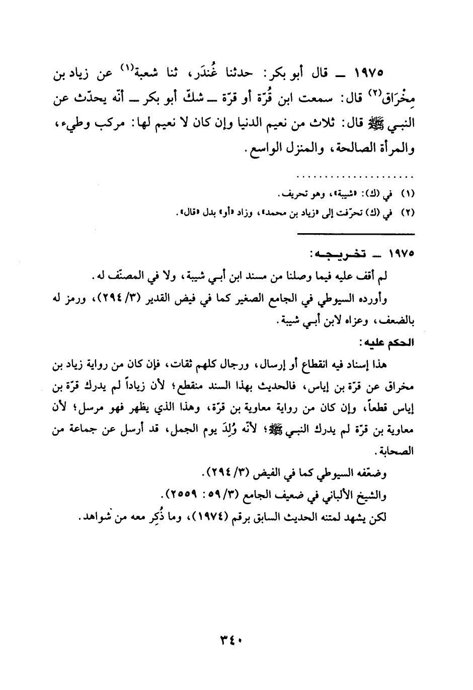 1975 - قَالَ أَبُو بَكْرِ حَدَّثَنَا غُنْدَرٌ ثنا شُعْبَةُ عَنْ زِيَادِ بْنِ مِخْرَاقٍ قَالَ سَمِعْتُ ابْنَ قُرَّةَ أو قرة شكل أَبُو بَكْرٍ أَنَّهُ يُحَدِّثُ عَنِ النَّبِيِّ صَلَّى اللَّهُ عَلَيْهِ وَسَلَّمَ قَالَ §ثَلَاثٌ مِنْ نَعِيمِ الدُّنْيَا وَإِنْ كَانَ لَا نَعِيمَ لها مركب وطئ وَالْمَرْأَةُ الصَّالِحَةُ وَالْمَنْزِلُ الْوَاسِعُ