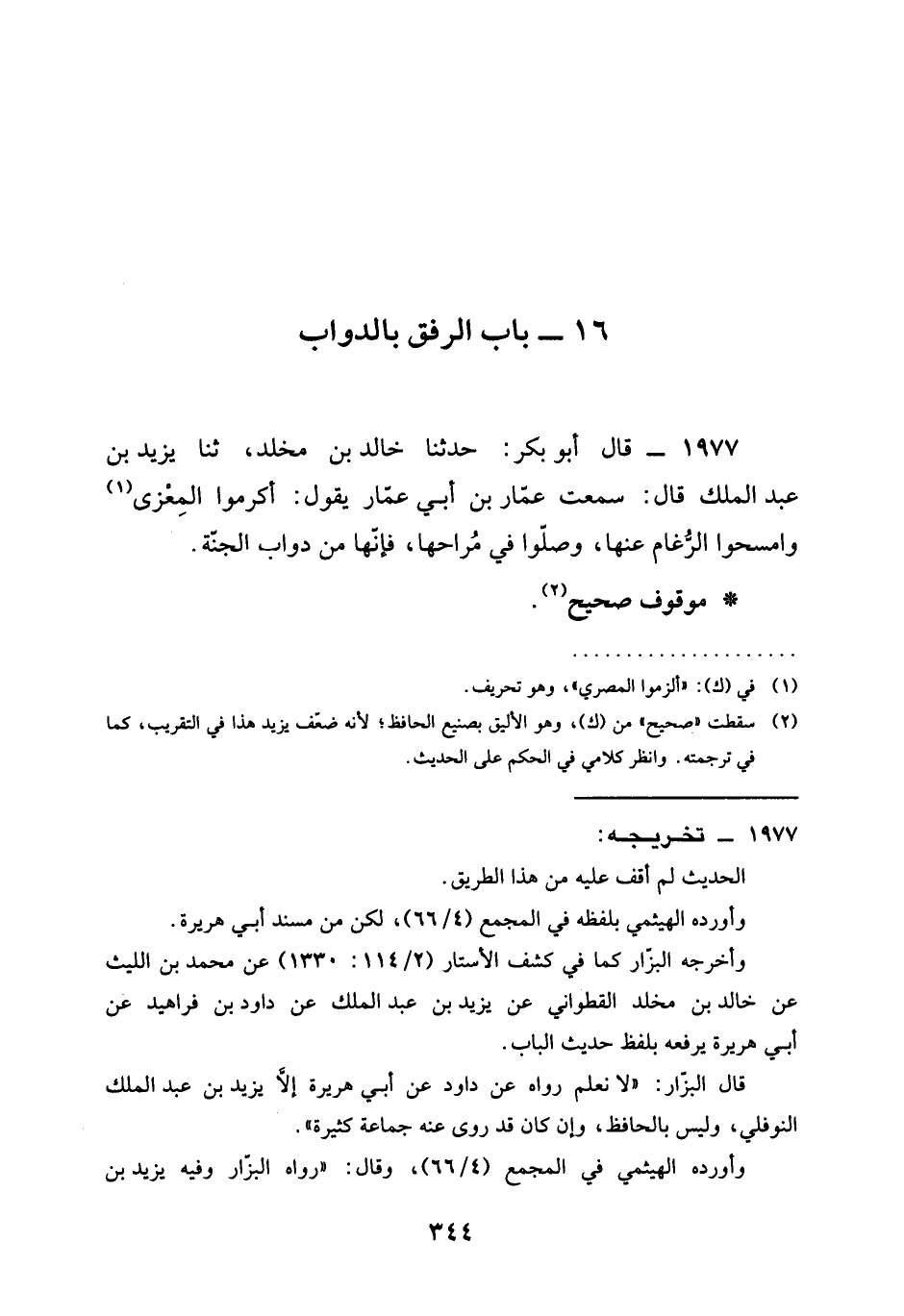 1977 - قَالَ أَبُو بَكْرٍ حدثناخالد بْنُ مَخْلَدٍ ثنا يَزِيدُ بْنُ عَبْدِ الْمَلِكِ قَالَ سَمِعْتُ عَمَّارَ بْنَ أَبِي عَمَّارٍ يَقُولُ §أَكْرِمُوا المغزى وَامْسَحُوا الرَّغَامَ عَنْهَا وَصَلُّوا فِي مُرَاحِهَا فَإِنَّهَا مِنْ دَوَابِّ الْجَنَّةِ
