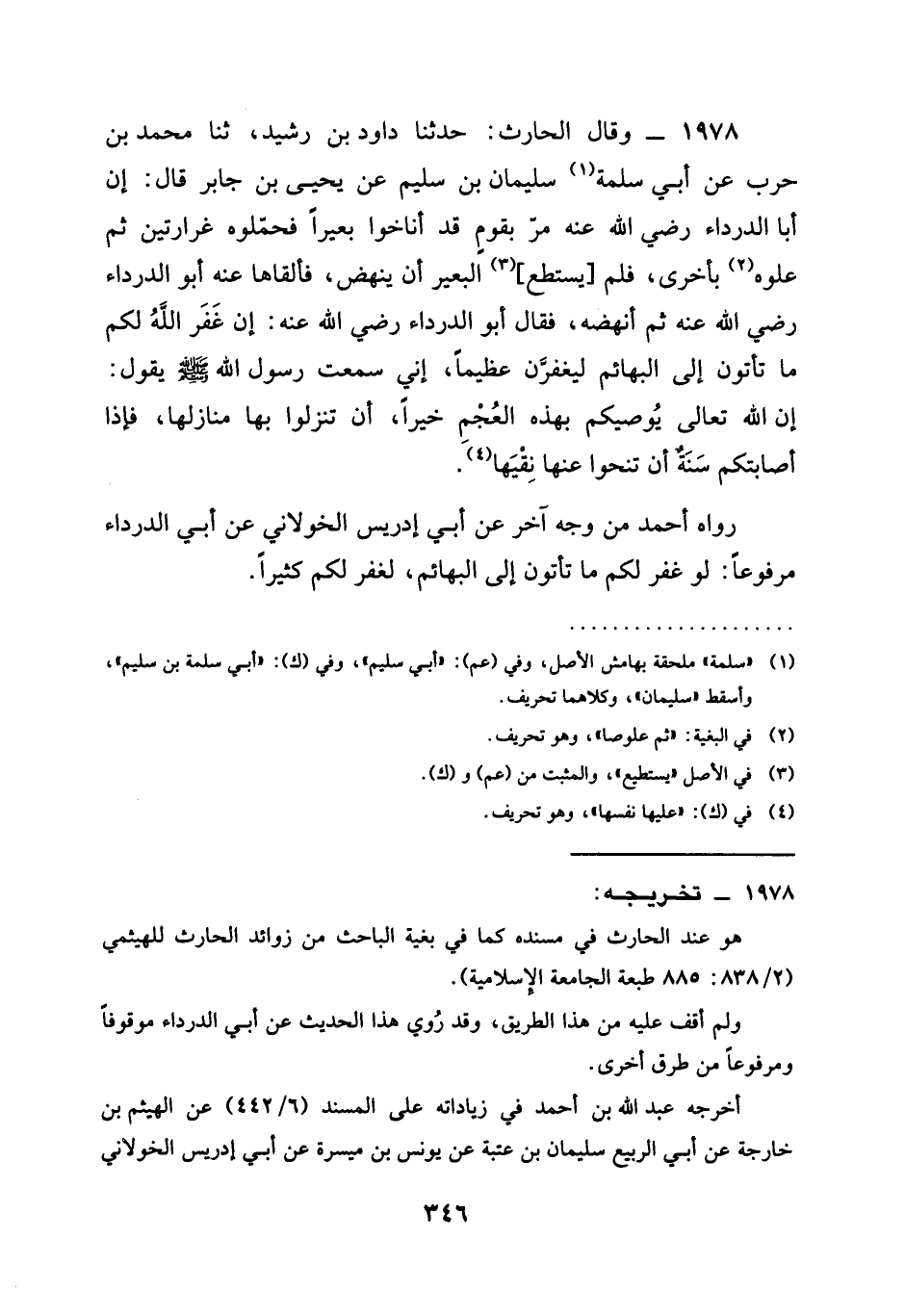 1978 - وَقَالَ الْحَارِثُ حَدَّثَنَا دَاوُدُ بْنُ رُشَيْدٍ ثنا مُحَمَّدُ بْنُ حَرْبٍ عَنْ أَبِي سَلَمَةَ سُلَيْمَانَ بْنِ سُلَيْمٍ عَنْ يَحْيَى بْنِ جَابِرٍ قَالَ إنَّ أَبَا الدَّرْدَاءِ رَضِيَ الله عَنْه مَرَّ بِقَوْمٍ قَدْ أَنَاخُوا بَعِيرًا فَحَمَّلُوهُ غِرَارَتَيْنِ ثُمَّ عَلَوْهُ بِأُخْرَى فَلَمْ يَسْتَطِعِ الْبَعِيرُ أَنْ يَنْهَضَ فَأَلْقَاهَا عَنْهُ أَبُو الدَّرْدَاءِ رَضِيَ الله عَنْه ثُمَّ أَنْهَضَهُ فَقَالَ أَبُو الدَّرْدَاءِ رَضِيَ الله عَنْه إِنْ غَفَرَ اللَّهُ لَكُمْ مَا تَأْتُونَ إِلَى الْبَهَائِمِ لَيَغْفِرَنَّ عَظِيمًا إِنِّي سَمِعْتُ رَسُولَ اللَّهِ صَلَّى اللَّهُ عَلَيْهِ وَسَلَّمَ يَقُولُ §إِنَّ اللَّهَ تَعَالَى يُوصِيكُمْ بِهَذِهِ الْعُجْمِ خَيْرًا أَنْ تَنْزِلُوا بِهَا مَنَازِلَهَا فَإِذَا أَصَابَتْكُمْ سَنَةٌ أَنْ تَنْحُوا عَنْهَا نِقيِهَا رَوَاهُ أَحْمَدُ مِنْ وَجْهٍ آخَرَ عَنْ أَبِي إِدْرِيسَ الْخَوْلَانِيِّ عَنْ أَبِي الدَّرْدَاءِ مَرْفُوعًا لَوْ غُفِرَ لَكُمْ مَا تَأْتُونَ إِلَى الْبَهَائِمِ لَغَفَرَ لَكُمْ كَثِيرًا