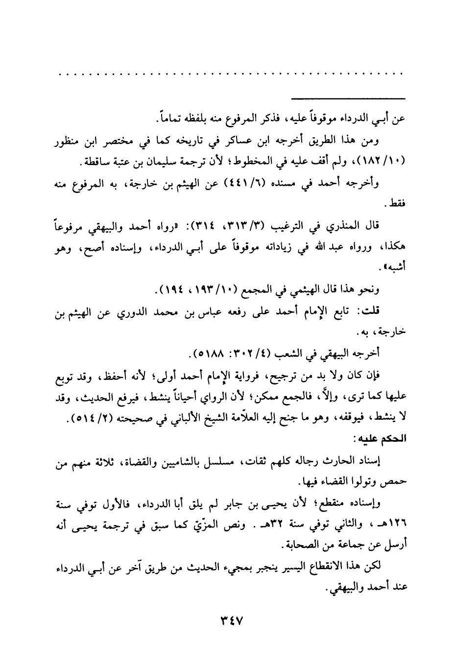 قال المنذري في الترغيب (3/ 313، 314): "رواه أحمد والبيهقي مرفوعًا هكذا، ورواه عبد الله في زياداته موقوفًا على أبي الدرداء، وإسناده أصح، وهو أشبه".