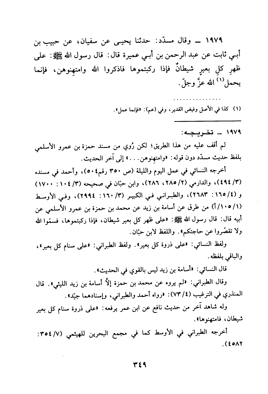 1979 - وَقَالَ مُسَدَّدٌ حَدَّثَنَا يَحْيَى عَنْ سُفْيَانَ عَنْ حَبِيبِ بْنِ أَبِي ثَابِتٍ عَنْ عَبْدِ الرَّحْمَنِ بْنِ أَبِي عَمِيرَةَ قَالَ قَالَ رَسُولُ اللَّهِ صَلَّى اللَّهُ عَلَيْهِ وَسَلَّمَ §عَلَى ظَهْرِ كُلِّ بَعِيرٍ شَيْطَانٌ فَإِذَا رَكِبْتُمُوهَا فَاذْكُرُوا اللَّهَ وَامْتَهِنُوهُنَّ فَإِنَّمَا يَحْمِلُ اللَّهُ عَزَّ وَجَلَّ