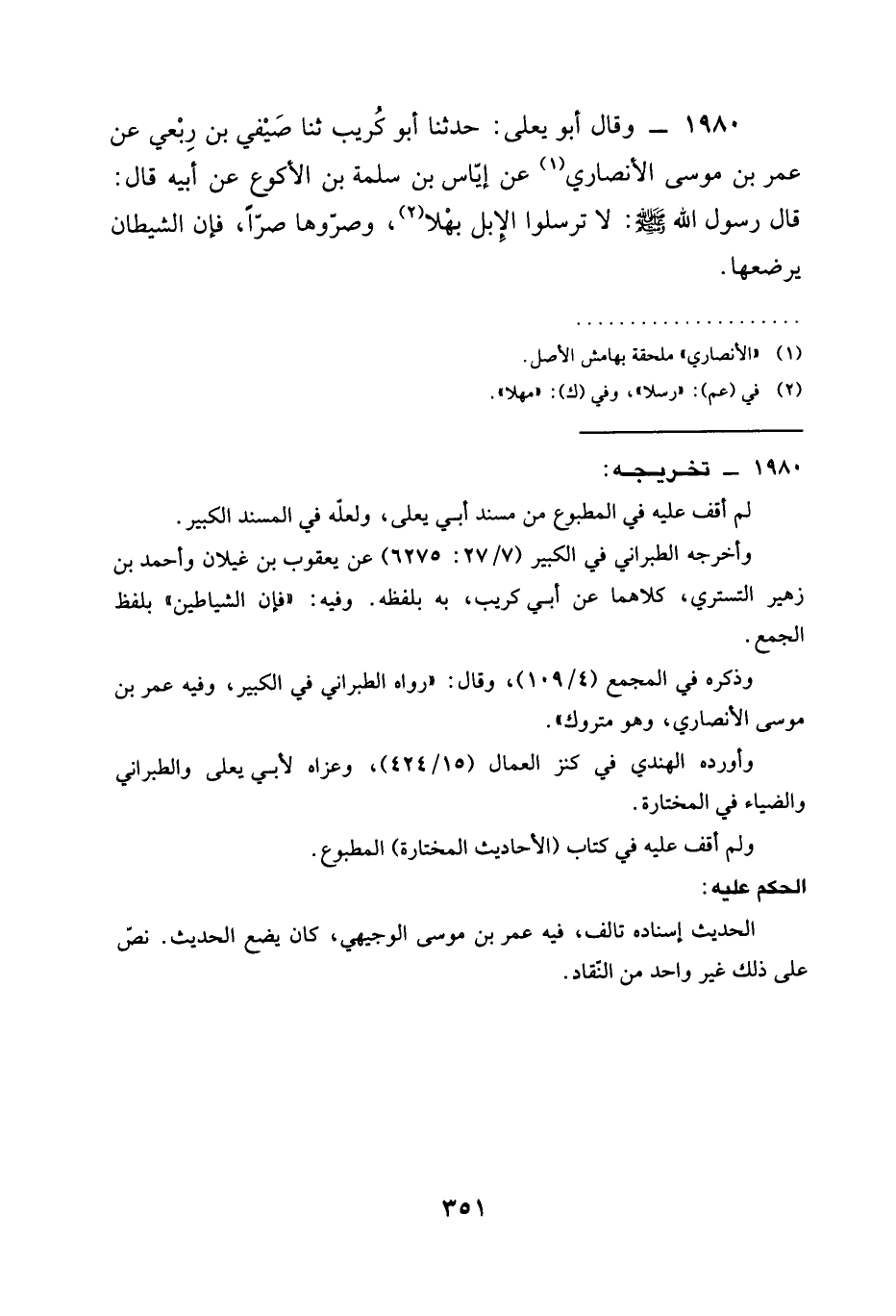 1980 - وَقَالَ أَبُو يَعْلَى حَدَّثَنَا أَبُو كريب ثنا الصيفي بْنُ رِبْعِيٍّ عَنْ عُمَرَ بْنِ مُوسَى الْأَنْصَارِيِّ عَنْ إِيَاسِ بْنِ سَلَمَةَ بْنِ الْأَكْوَعِ عَنْ أَبِيهِ قَالَ قَالَ رَسُولُ اللَّهِ صَلَّى اللَّهُ عَلَيْهِ وَسَلَّمَ §لَا تُرْسِلُوا الْإِبِلَ بَهْلًا وَصُرُّوهَا صَرًّا فَإِنَّ الشَّيْطَانَ يَرْضَعُهَا